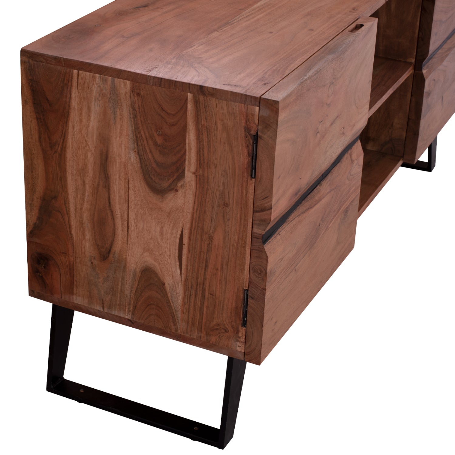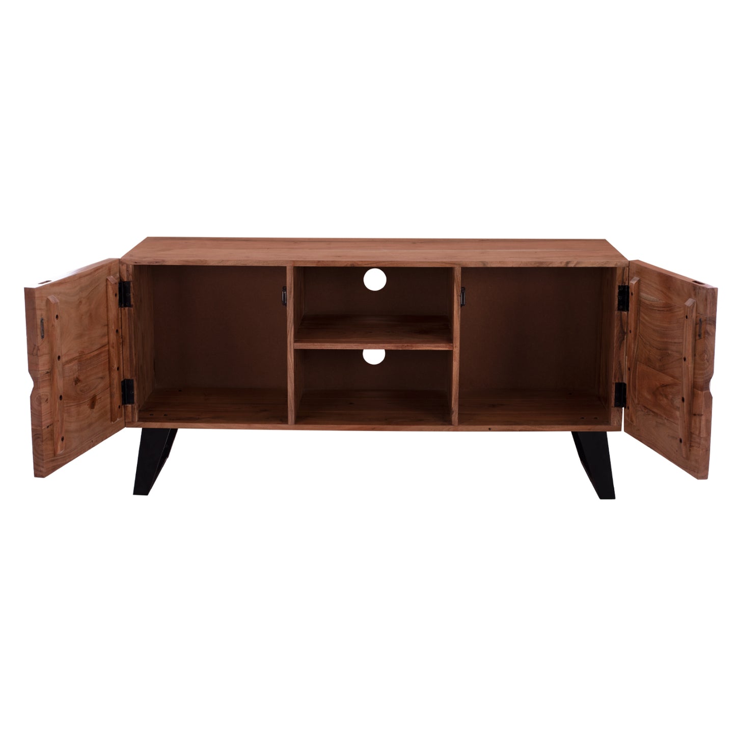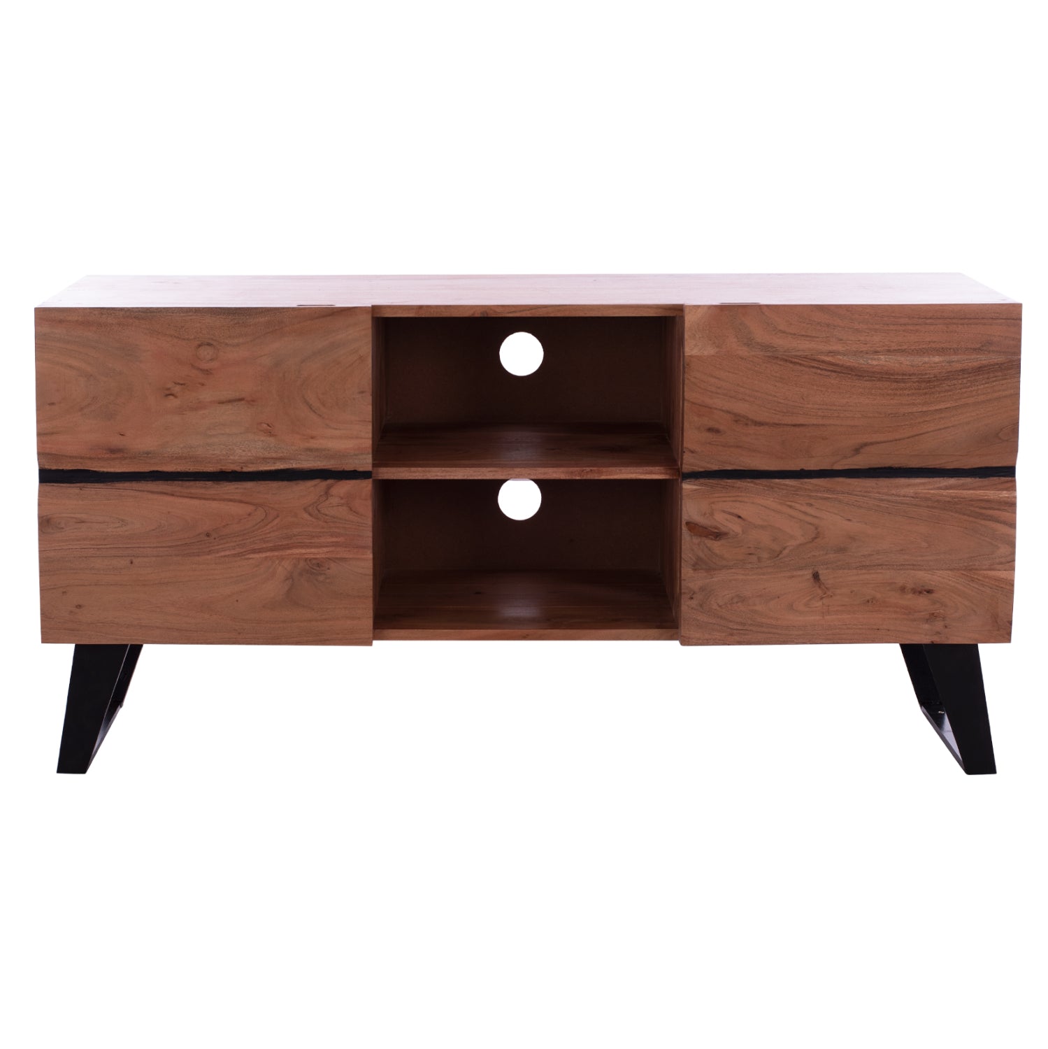 Έπιπλο τηλεόρασης από μασίφ ξύλο Ακακίας σε φυσική απόχρωση και μεταλλικά πόδια σε μαύρο χρώμα.