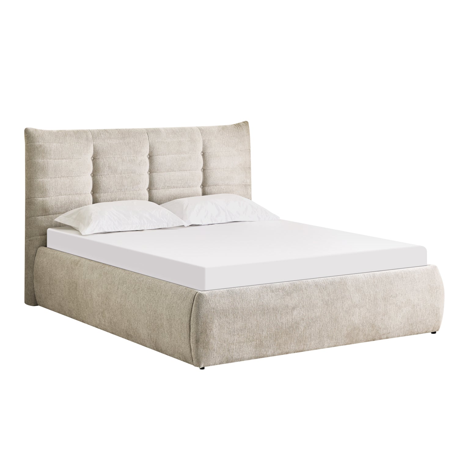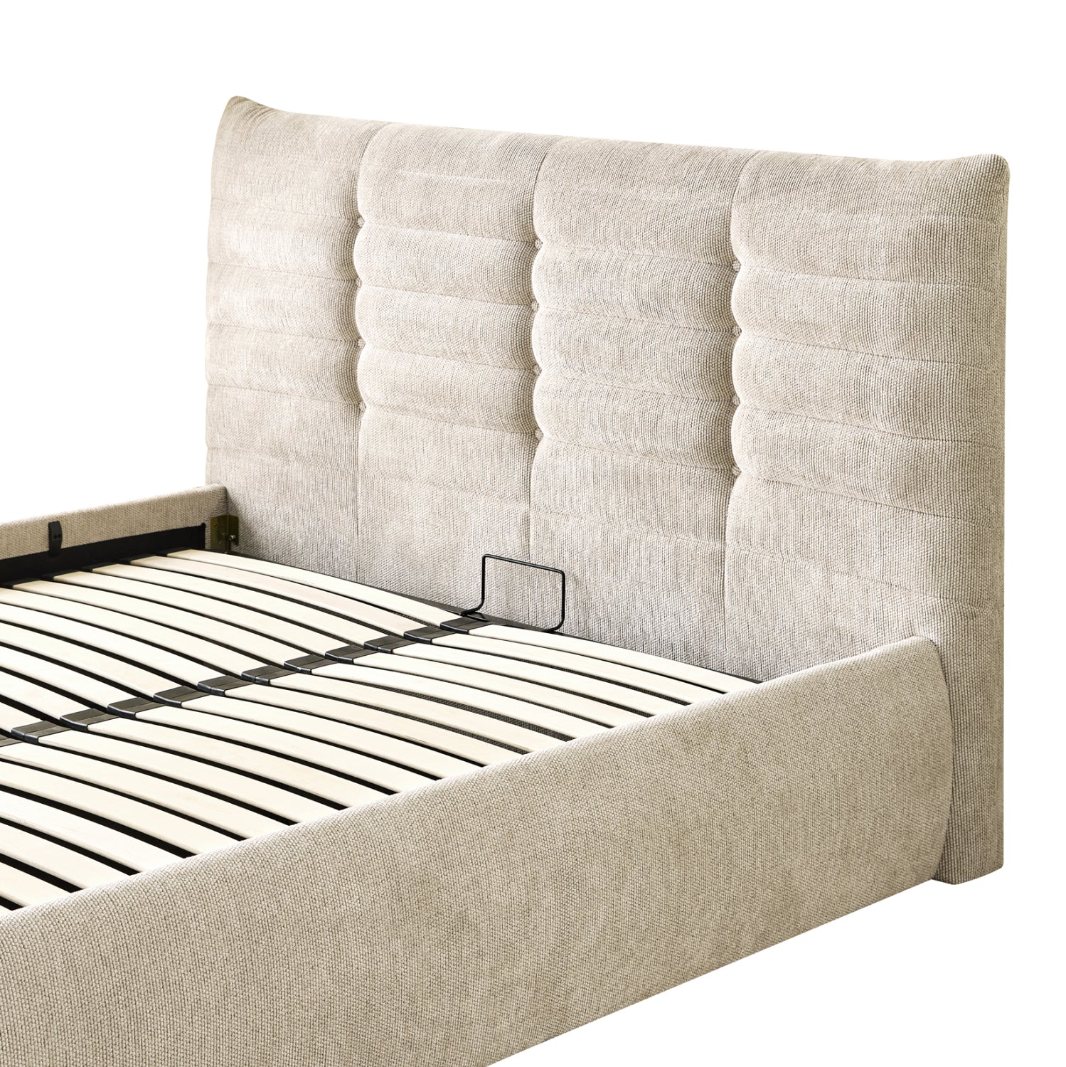 Το στρώμα στηρίζεται σε 20 σειρές εργονομικές τάβλες στήριξης, οι οποίες τοποθετούνται σε ένα μεταλλικό πλαίσιο που ανασηκώνεται με μηχανισμό ασφαλείας, προσφέροντας έναν μεγάλο αποθηκευτικό χώρο επενδυμένο επίσης με ύφασμα. Μια μοντέρνα πρόταση που θα ανανεώσει το υπνοδωμάτιό σας.