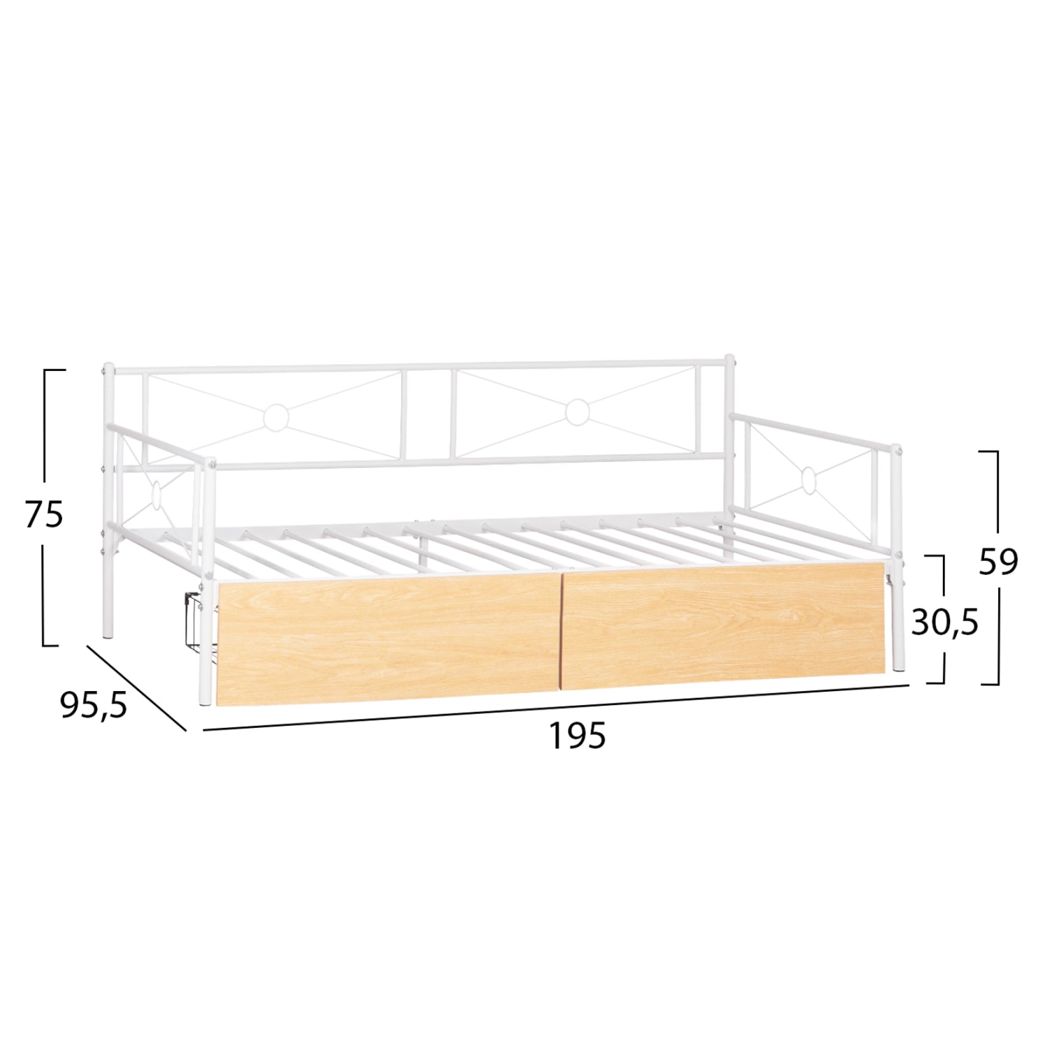 Πρόκειται για μια αμιγώς μεταλλική κατασκευή σε ΛΕΥΚΟ χρώμα που μπορεί άνετα να σταθεί και να συνδυαστεί με πληθώρα διακοσμητικών μοτίβων σε κάθε χώρο. Η πλάτη είναι μεταλλική με συμμετρικά μεταλλικά σχέδια ενώ και τα μπράτσα είναι παρόμοιας αισθητικής. Δεν διαθέτει τάβλες για την στήριξη του στρώματος αλλά μεταλλικές ράβδους. Η πρακτικότητά του τονίζεται ακόμα περισσότερο χάρη στα δύο συρτάρια δαπέδου με ροδάκια, που τοποθετούνται κάτω από το κρεβάτι, και διαθέτουν όμορφη πρόσοψη μελαμίνης σε SONAMA χρώμα. Πρόκειται για μια ιδανική επιλογή τόσο για το υπνοδωμάτιό σας, όσο και για επαγγελματικούς χώρους, όπως ξενοδοχεία και Airbnb.