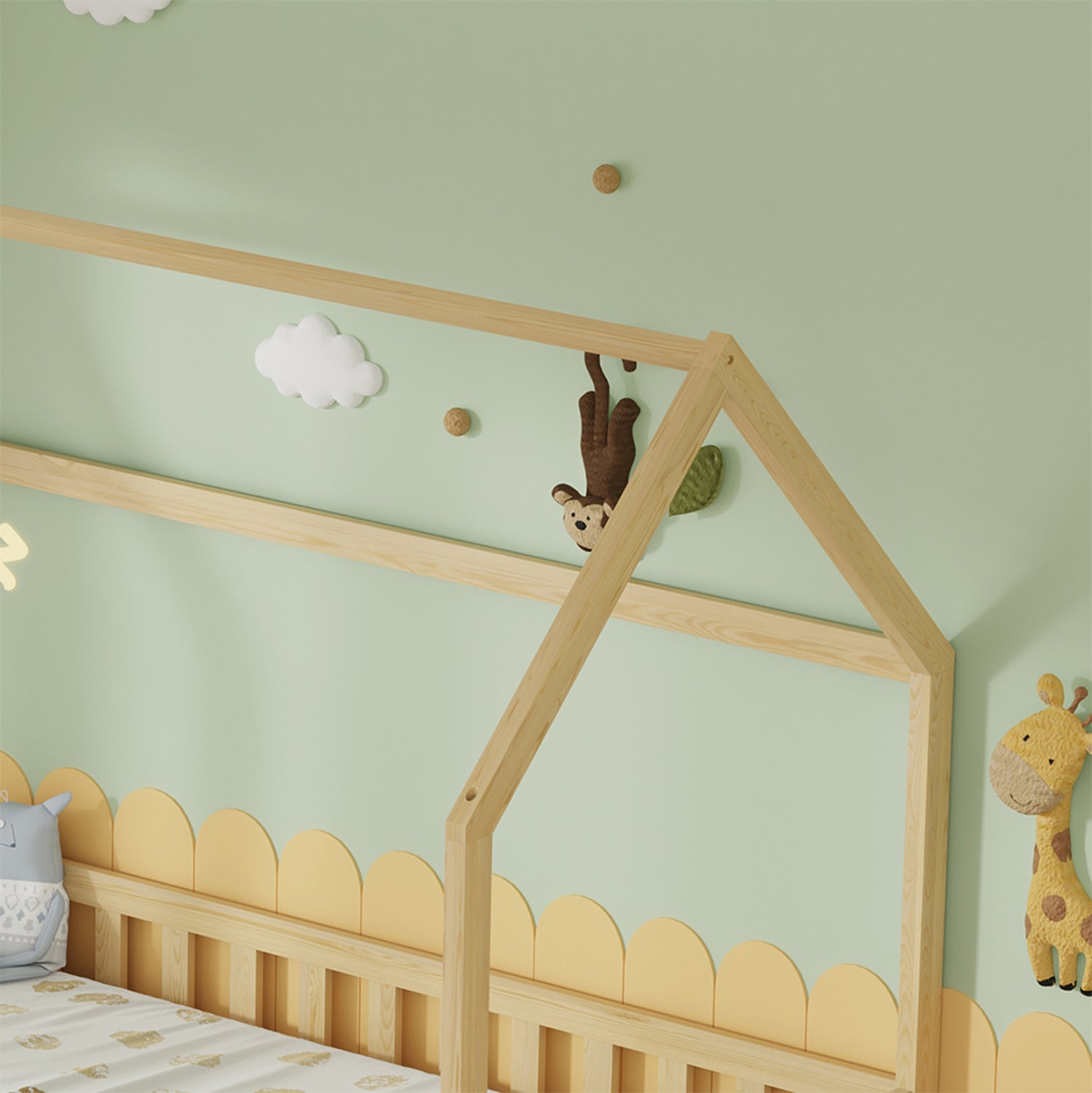 Το στρώμα τοποθετείται σε τάβλες κατασκευασμένες από ξυλεία κόντρα πλακέ. Ολόκληρο το κρεβάτι έχει σχήμα σπιτιού και μάλιστα αρκετά ψηλό, που θα δώσει μια ευχάριστη, «ζεστή», και παιχνιδιάρικη όψη σε κάθε παιδικό δωμάτιο.