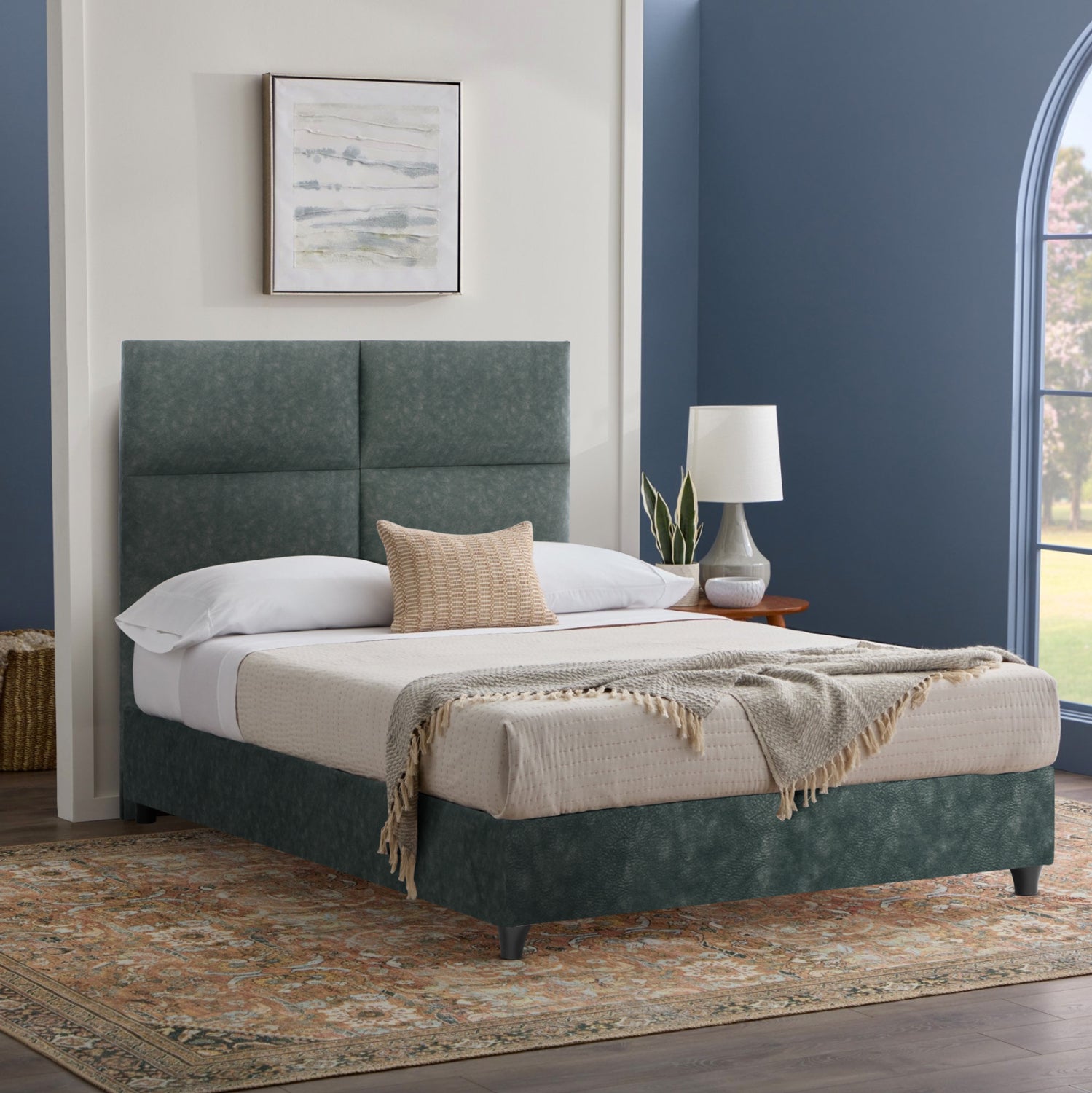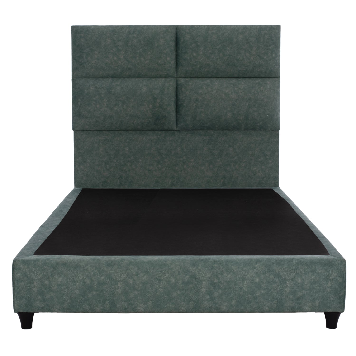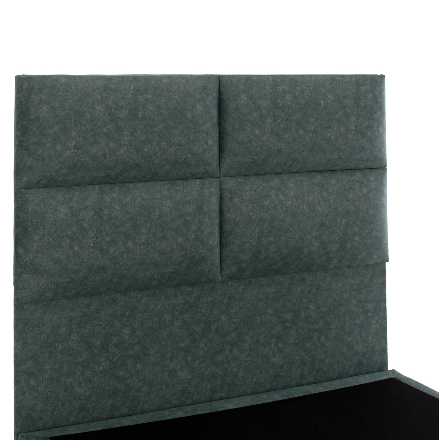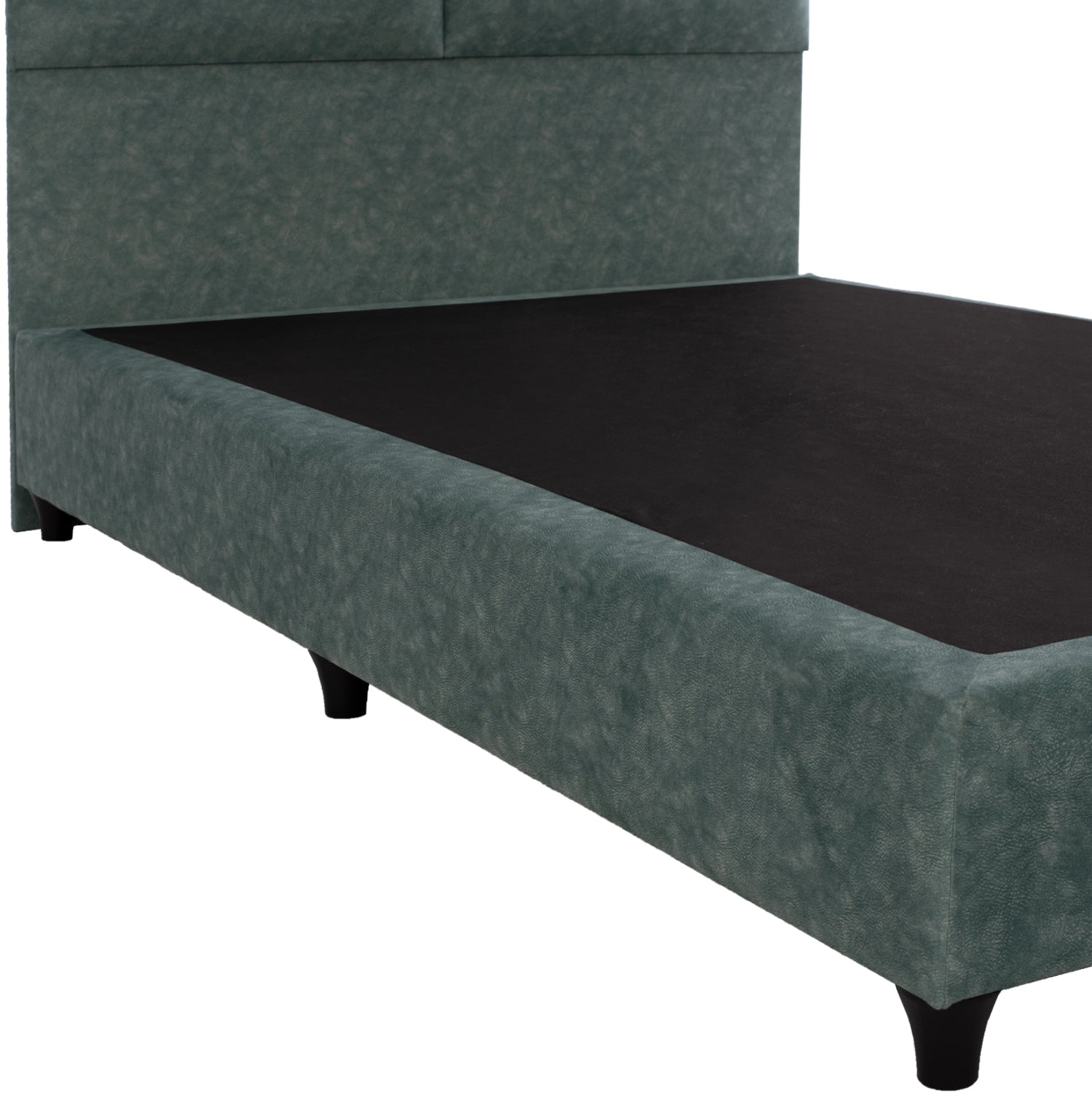 Το κεφαλάρι είναι ψηλό και επενδυμένο με καπιτονέ τεχνοτροπία σε μεγάλα ορθογώνια, ενώ και όλη η επένδυση του κρεβατιού είναι από ανάγλυφο ύφασμα τύπου NUBUCK. Το ΠΡΑΣΙΝΟ χρώμα σε όλο το κρεβάτι είναι όμορφο και μπορεί να συνδυαστεί με πληθώρα διακοσμητικών μοτίβων. Όμως, το κύριο χαρακτηριστικό αυτού του κρεβατιού είναι ότι δεν ακολουθεί την κλασική κατασκευή με τις τάβλες του σομιέ για την στήριξη του στρώματος, αλλά αντίθετα αποτελείται από μια συνεχόμενη επιφάνεια (2 μοριοσανίδες) πάνω στην οποία τοποθετείται το στρώμα! Σε διαστάσεις στρώματος 120x200 εκ. θα χωρέσει 2 άτομα χωρίς πρόβλημα!