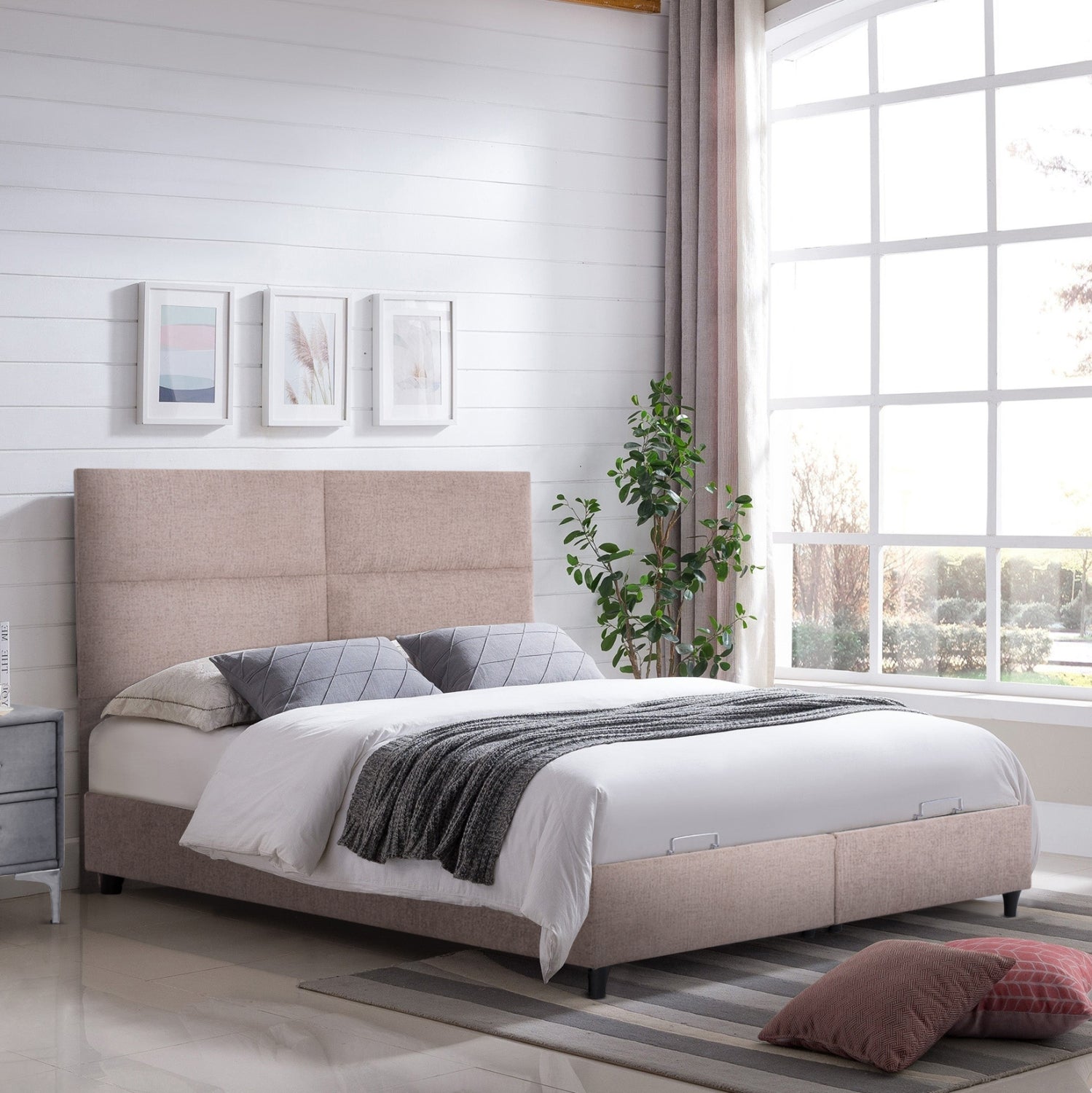 Το κρεβάτι MILO έχει ψηλό κεφαλάρι και επενδυμένο με καπιτονέ τεχνοτροπία σε μεγάλα ορθογώνια, ενώ και όλη η επένδυση του κρεβατιού είναι ζεστό ΜΠΟΥΚΛΕ ύφασμα. Το ουδέτερο ΜΠΕΖ χρώμα σε όλο το κρεβάτι είναι εντυπωσιακό και μπορεί να συνδυαστεί με πληθώρα διακοσμητικών μοτίβων. Όμως, το κύριο χαρακτηριστικό αυτού του κρεβατιού είναι ότι δεν ακολουθεί την κλασική κατασκευή με τις τάβλες του σομιέ για την στήριξη του στρώματος, αλλά αντίθετα αποτελείται από 2 μοριοσανίδες πάνω στις οποίες τοποθετείται το στρώμα! Επιπλέον, η κάθε επιφάνεια από μοριοσανίδα ανασηκώνεται με μεταλλικό μηχανισμό ασφαλείας (gas lifts) και μεταλλικές λαβές προσφέροντας έναν μεγάλο αποθηκευτικό χώρο.