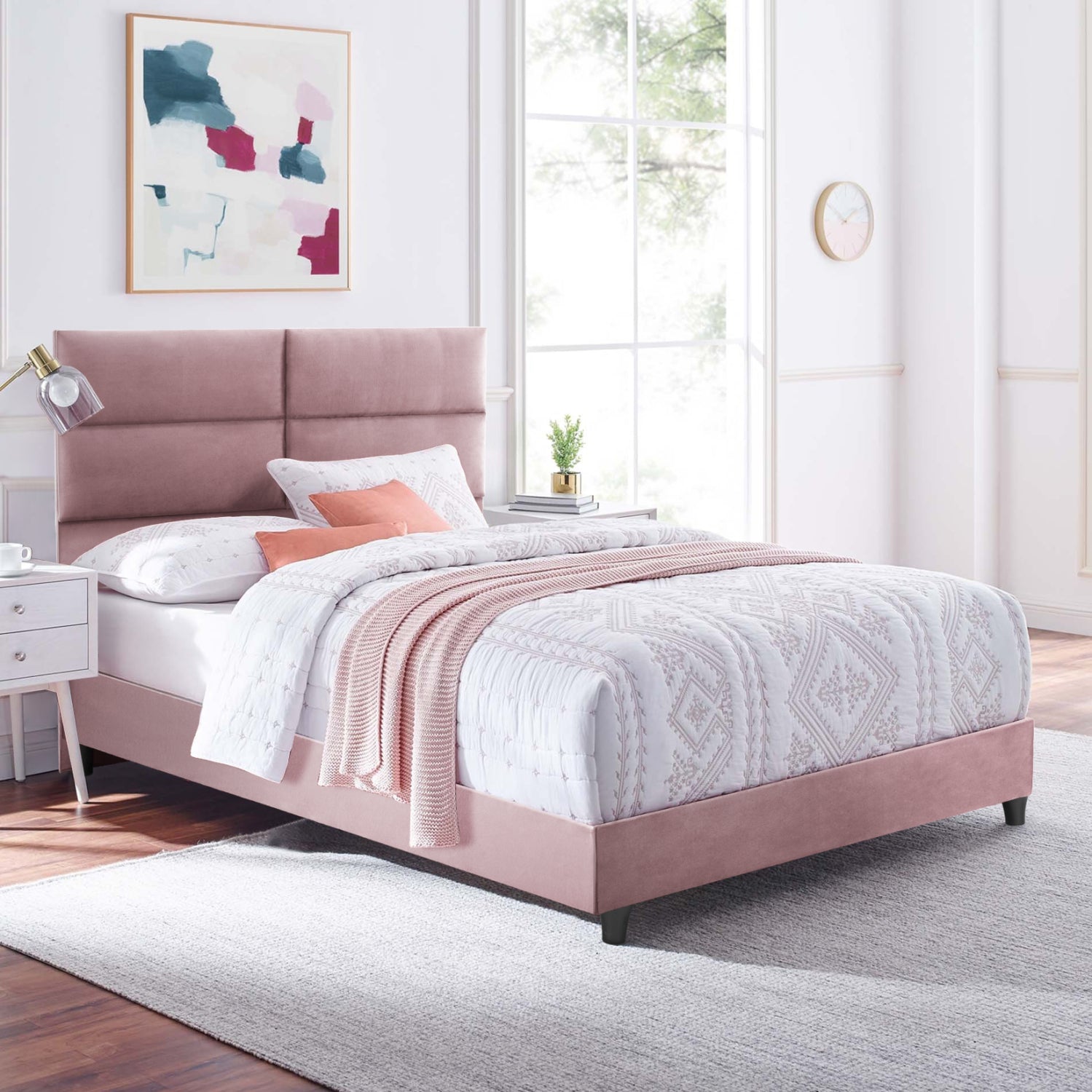 Το κεφαλάρι είναι ψηλό και επενδυμένο με καπιτονέ τεχνοτροπία σε μεγάλα ορθογώνια, ενώ και όλη η επένδυση του κρεβατιού είναι από βελούδινο ύφασμα. Το ΣΑΠΙΟ ΜΗΛΟ χρώμα σε όλο το κρεβάτι είναι εντυπωσιακό και μπορεί να συνδυαστεί με πληθώρα διακοσμητικών μοτίβων.