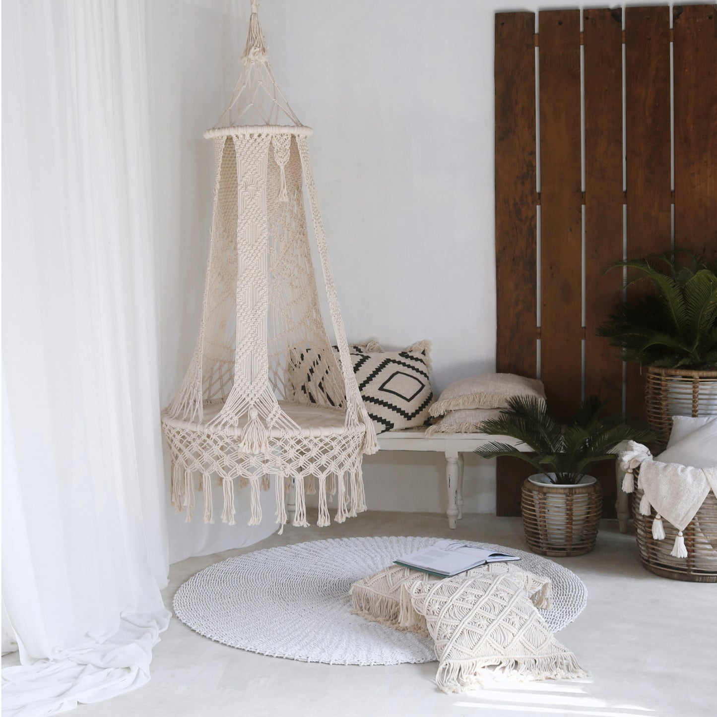 Η αιώρα ΗΜ9345 είναι η νέα προσθήκη στην γκάμα μας. Διαχρονικά, οι αιώρες αποτελούν την επιτομή της ξεγνοιασιάς και της χαλάρωσης. Εμείς σας προσφέρουμε την αιώρα αυτή σε στυλ στρογγυλής κρεμαστής φωλιάς, κατασκευασμένη από βαμβακερό σχοινί σε πλέξη μακραμέ! Το μόνο που χρειάζεστε είναι ένα σημείο κρέμασης και αφήστε την αιώρα-φωλιά να αναλάβει την ξεκούρασή σας με το ελαφρύ της κούνημα.