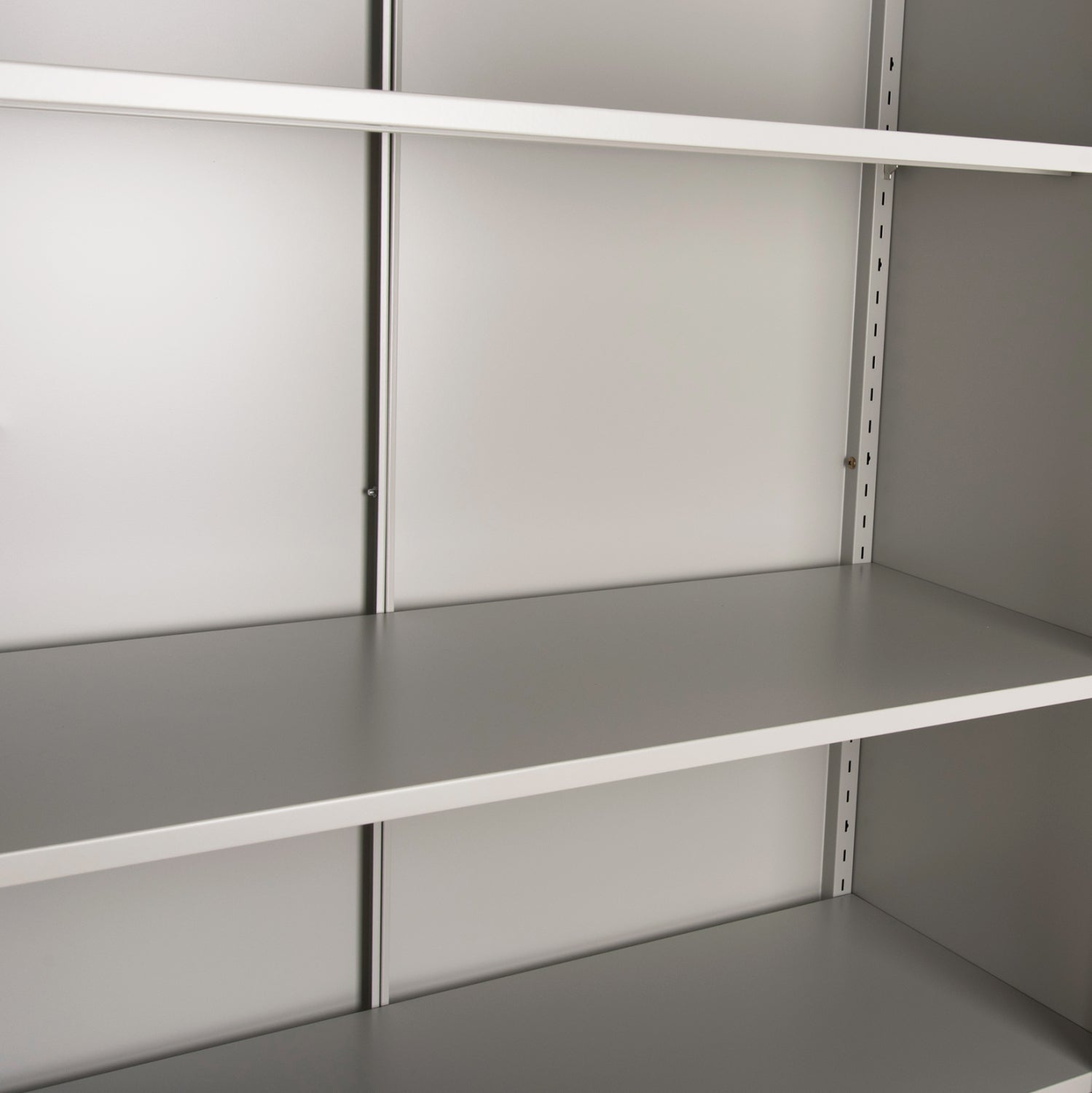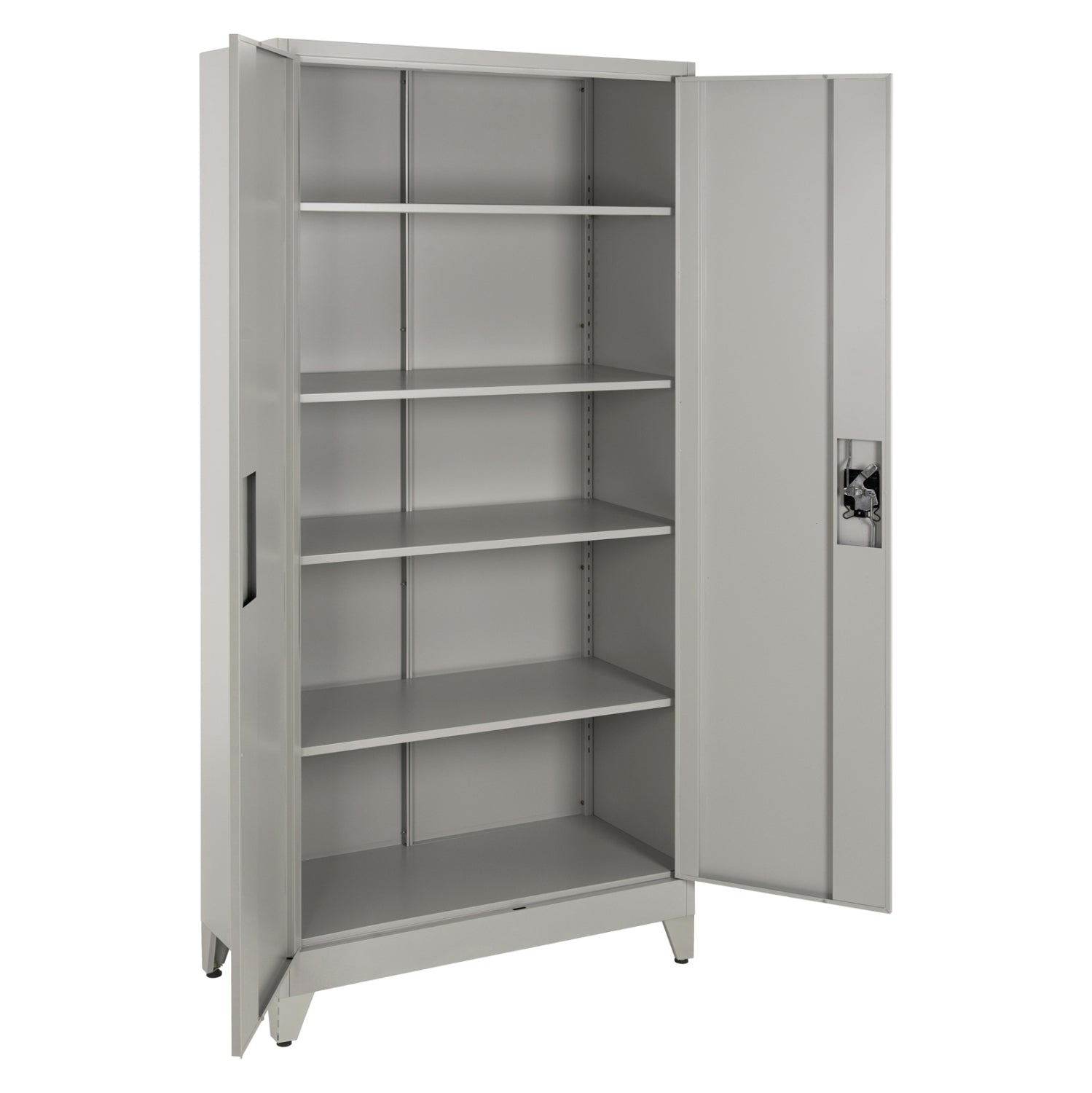 Η DURON είναι μια πρακτικότατη μεταλλική ντουλάπα με πόδια που έχει φτιαχτεί με γνώμονα την χωρητικότητα και την ανθεκτικότητα. Είναι δίφυλλη με τις δύο πόρτες να κλείνουν ακριβώς στην μέση της κατασκευής, ενώ το εσωτερικό είναι ένας ενιαίος χώρος χωρίς κάθετα χωρίσματα. Διαθέτει μια μεταλλική ΙΝΟΧ μπάρα στο επάνω μέρος για κρέμασμα, και 4 ράφια που δημιουργούν 5 αποθηκευτικούς χώρους. Οι πόρτες διαθέτουν κλειδαριά που κλειδώνει με κλειδί, ενώ το χρώμα της ντουλάπας είναι πολύ ανοιχτό γκρι.