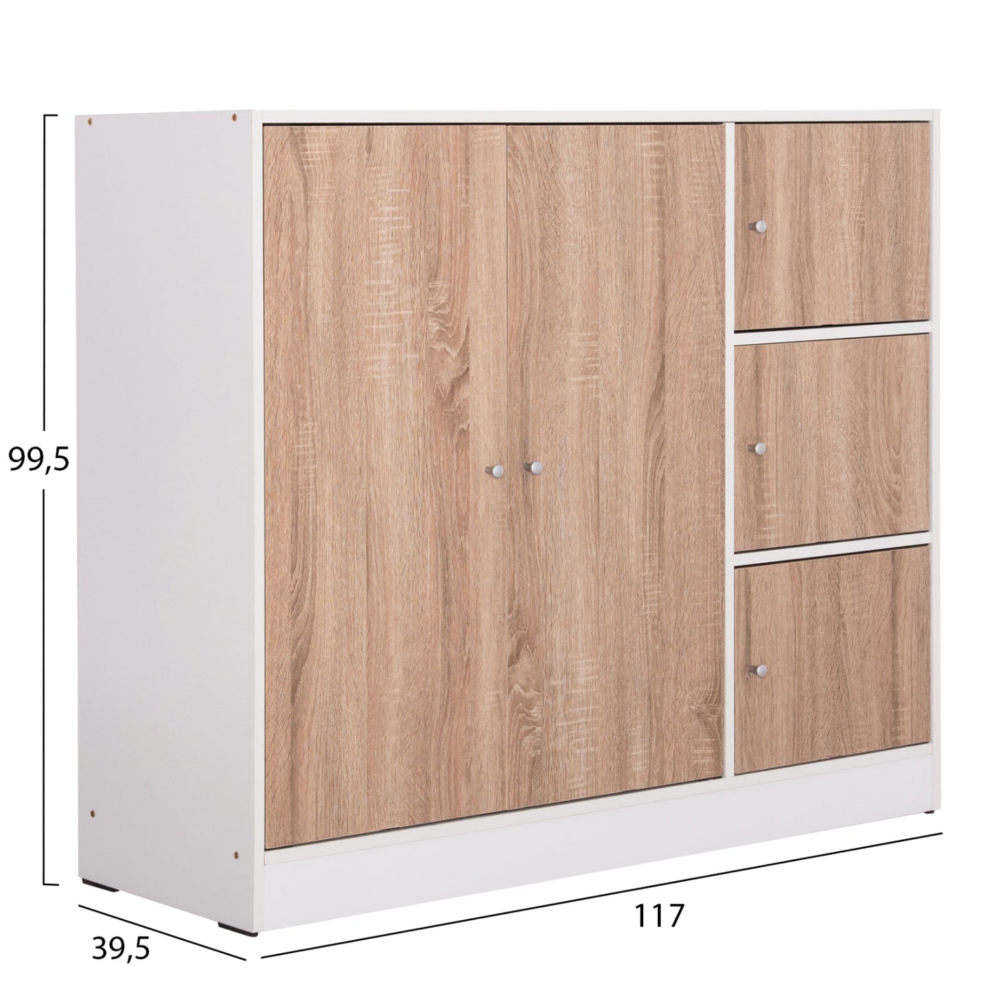 Σας αρέσει να είστε τακτοποιημένοι και καθαροί; Σας παρουσιάζουμε το χαμηλό ντουλάπι μελαμίνης MATIN σε χρώμα SONAMA ΟΑΚ και ΛΕΥΚΟ. Διαθέτει 4 ντουλάπια με μεγάλη χωρητικότητα ως χώρος γενικής αποθήκευσης διάφορων αντικειμένων. Συγκεκριμένα, στην μια πλευρά υπάρχει το ένα ντουλάπι (διπλό), και στην άλλη 3 μικρότερα. Ιδανικό για πληθώρα χώρων και χρήσεων, όπως το παιδικό δωμάτιο κ.α.