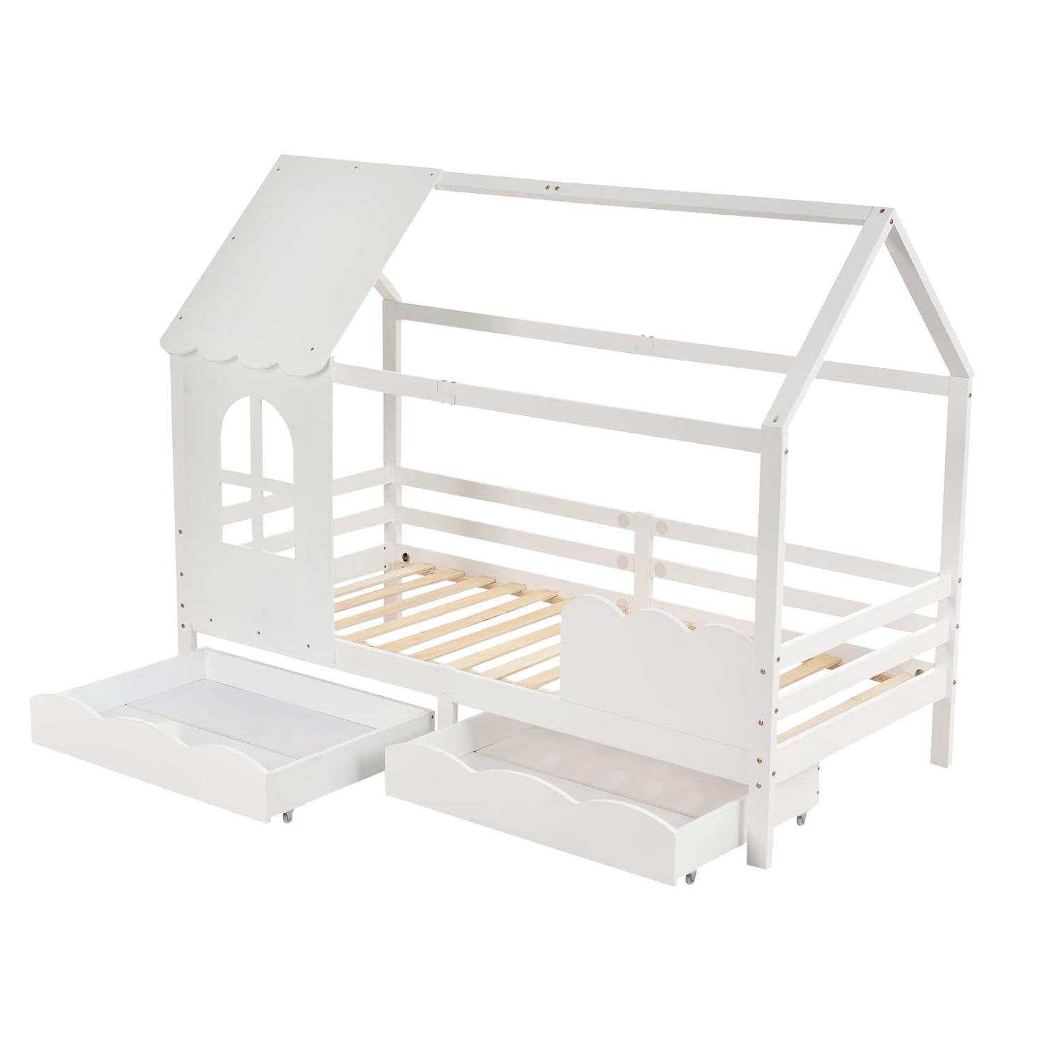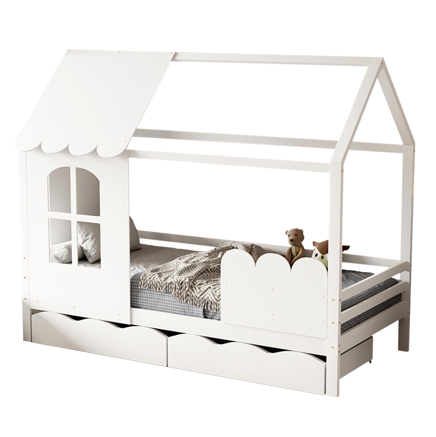 Το DOMER είναι ακόμα ένα καινούργιο παιδικό κρεβάτι τύπου Montessori που σημαίνει ότι έχει σχεδιαστεί σύμφωνα με το εκπαιδευτικό σύστημα Montessori, κατά το οποίο τα παιδιά μαθαίνουν καλύτερα, όταν επιλέγουν μόνα τους τι θα κάνουν. Το χαμηλό ύψος κρεβατιού χωρίς πόδια, βοηθά να εξερευνούν την αυτονομία τους και να ανεβοκατεβαίνουν από το κρεβάτι τους ελεύθερα ανά πάσα στιγμή. Είναι σε διάσταση για μονό στρώμα 90x190 εκ, και αποτελεί μια άριστης ποιότητας, μοντέρνα και ασφαλή επιλογή για το παιδικό δωμάτιο. Είναι ξύλινο σε ΛΕΥΚΟ χρώμα βαμμένο με αβλαβές μη τοξικό βερνίκι με βάση το νερό, ιδανικό για παιδιά. Το στρώμα τοποθετείται σε τάβλες κατασκευασμένες από ξυλεία κόντρα πλακέ. Ολόκληρο το κρεβάτι έχει σχήμα σπιτιού με παραθυράκι, που θα δώσει μια ευχάριστη, «ζεστή», και παιχνιδιάρικη όψη σε κάθε παιδικό δωμάτιο. Πέρα, όμως, από ευχάριστο στην όψη, αυτό το κρεβάτι είναι και πρακτικό αφού διαθέτει 2 μεγάλα συρτάρια στην κάτω πλευρά, για να αποθηκεύετε οτιδήποτε χρειαστεί.