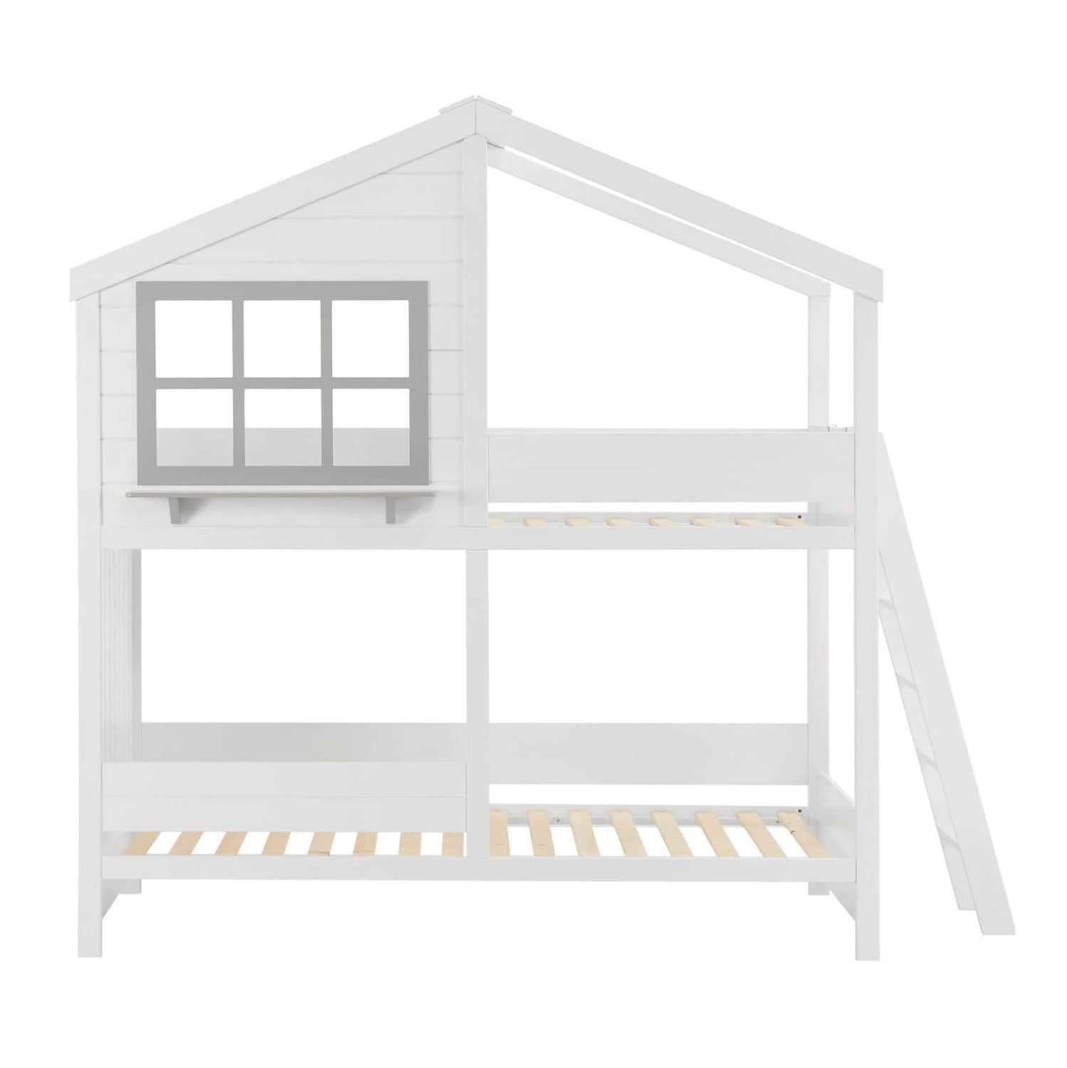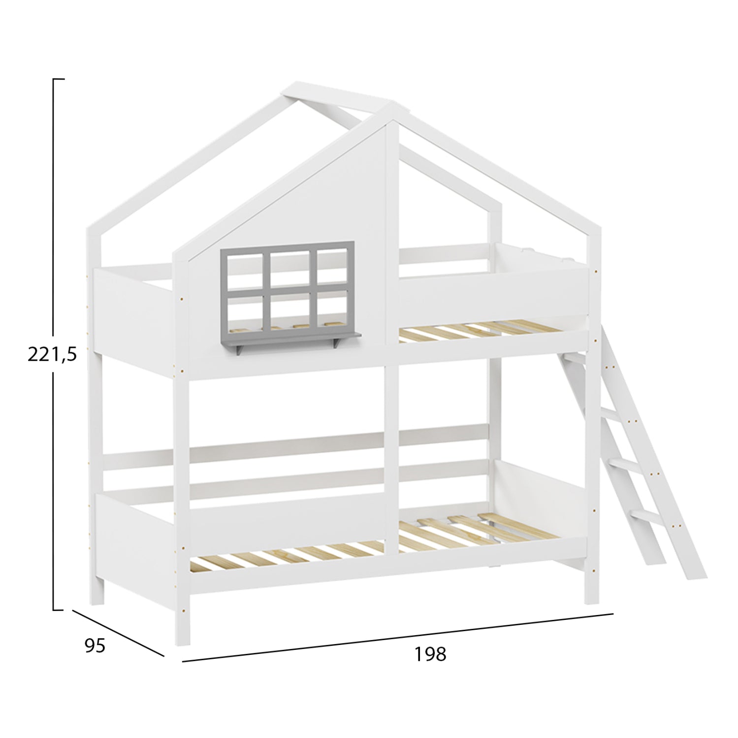 Σας παρουσιάζουμε την καινούργια παιδική κουκέτα-κρεβάτι COMBO. Είναι σε διάσταση για μονά στρώματα 90x200 εκ, και αποτελεί μια άριστης ποιότητας, μοντέρνα και ασφαλή επιλογή για το παιδικό δωμάτιο. Είναι ξύλινη σε ΛΕΥΚΟ χρώμα βαμμένη με αβλαβές μη τοξικό βερνίκι με βάση το νερό, ιδανικό για παιδιά. Τα στρώματα τοποθετούνται σε τάβλες κατασκευασμένες από ξυλεία κόντρα πλακέ. Η κουκέτα έχει σχήμα σπιτάκι και μάλιστα το επάνω κρεβάτι έχει κι ένα παραθυράκι με εξωτερικό ράφι που θα εξάψει την φαντασία των παιδιών. Η πρόσβαση στο επάνω κρεβάτι το οποίο διαθέτει και κάγκελα περιμετρικά, γίνεται με μια όμορφη σκάλα στην δεξιά πλευρά. Το κάτω κρεβάτι διαθέτει επίσης κάγκελα, αλλά και σχετικά ψηλά πόδια.
