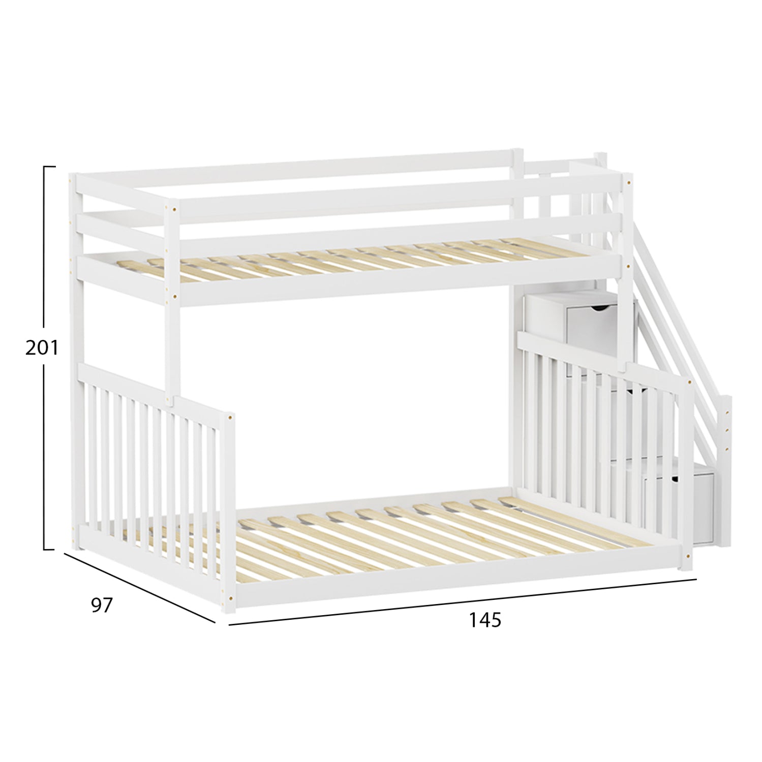 Η παιδική κουκέτα BEAMER είναι άλλη μια καινούργια προσθήκη στην γκάμα μας και αποτελεί μια άριστης ποιότητας, μοντέρνα και ασφαλή επιλογή για το παιδικό δωμάτιο. Είναι κατασκευασμένη από ξύλο πεύκου σε ΛΕΥΚΟ χρώμα βαμμένο με αβλαβές μη τοξικό βερνίκι με βάση το νερό, ιδανικό για παιδιά. Διαθέτει ένα κρεβάτι σε διάσταση ημίδιπλου στρώματος (140x190εκ) που πατάει απευθείας στο πάτωμα, κι ένα μονό (90x190εκ) ακριβώς από πάνω. Τα στρώματα τοποθετούνται σε τάβλες κατασκευασμένες από ξυλεία κόντρα πλακέ. Η πρόσβαση στο επάνω κρεβάτι γίνεται με πρακτική πλαϊνή σκάλα, τα σκαλιά της οποίας είναι ντουλαπάκια για τοποθέτηση αντικειμένων! Μια ιδανική πρόταση για δωμάτια με περιορισμένο χώρο.