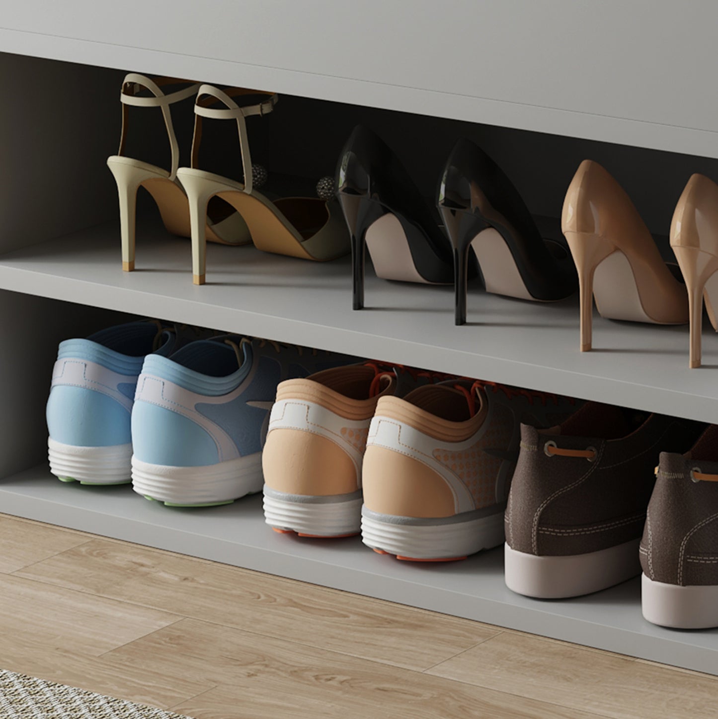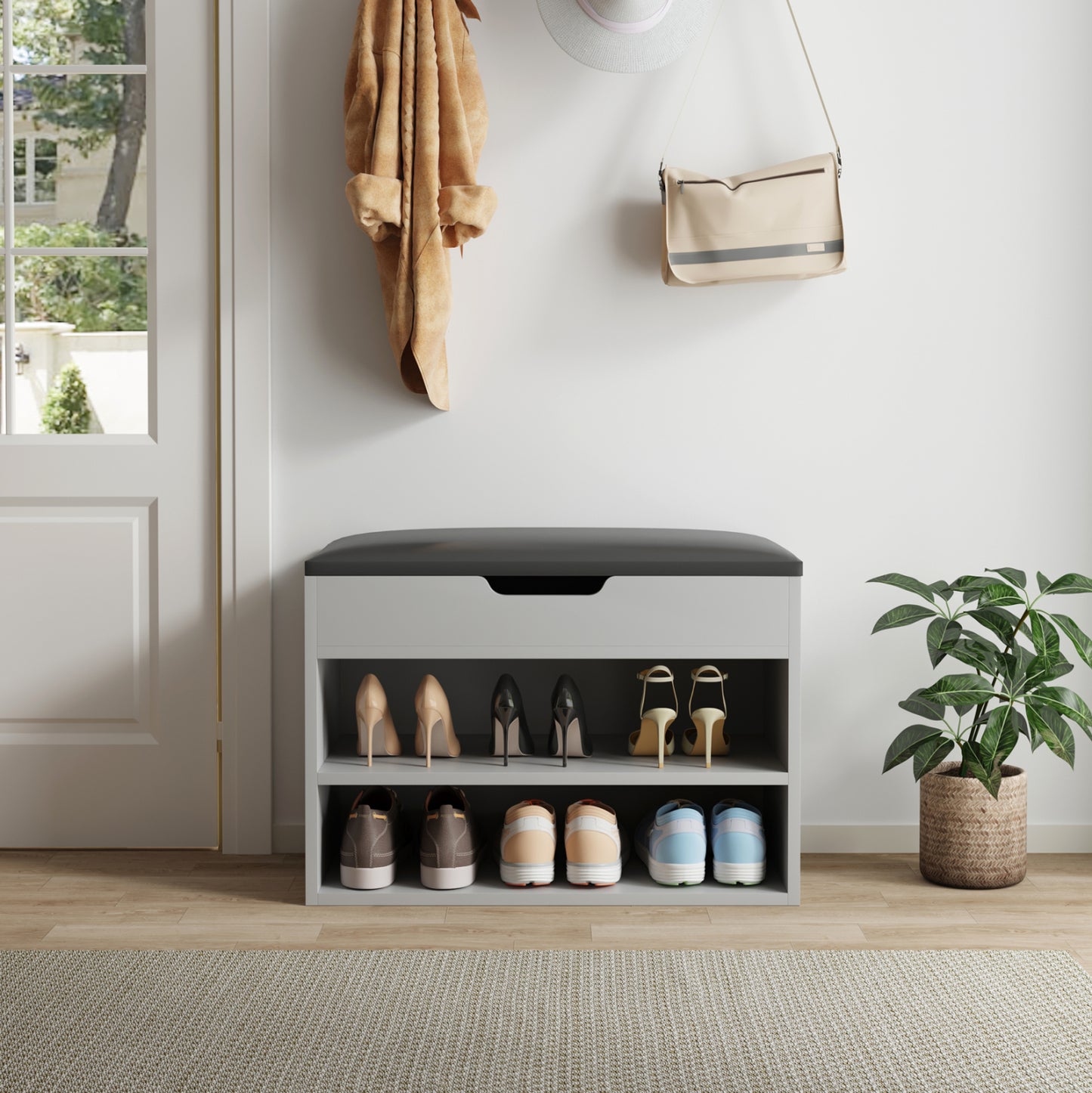 Σας αρέσει να είστε τακτοποιημένοι και καθαροί; Σας παρουσιάζουμε την παπουτσοθήκη μελαμίνης ROMIR σε ΓΚΡΙ χρώμα με πολύ χαμηλά μεταλλικά πόδια. Ένα έπιπλο που εκτός από χώρο αποθήκευσης παπουτσιών, διαθέτει και κάθισμα επενδυμένο με PU leather σε ΑΝΘΡΑΚΙ χρώμα, για να φοράτε τα παπούτσια σας καθιστοί. Ο χώρος αποθήκευσης είναι ανοιχτός με 2 επίπεδα, ενώ κάτω από το κάθισμα που ανασηκώνεται υπάρχει ακόμα ένας, πιο ρηχός, χώρος αποθήκευσης αντικειμένων. Σκοπός μας είναι να σας βοηθήσουμε να οργανώσετε και να βελτιώσετε με τον καλύτερο δυνατό τρόπο την λειτουργικότητα του σπιτιού σας.