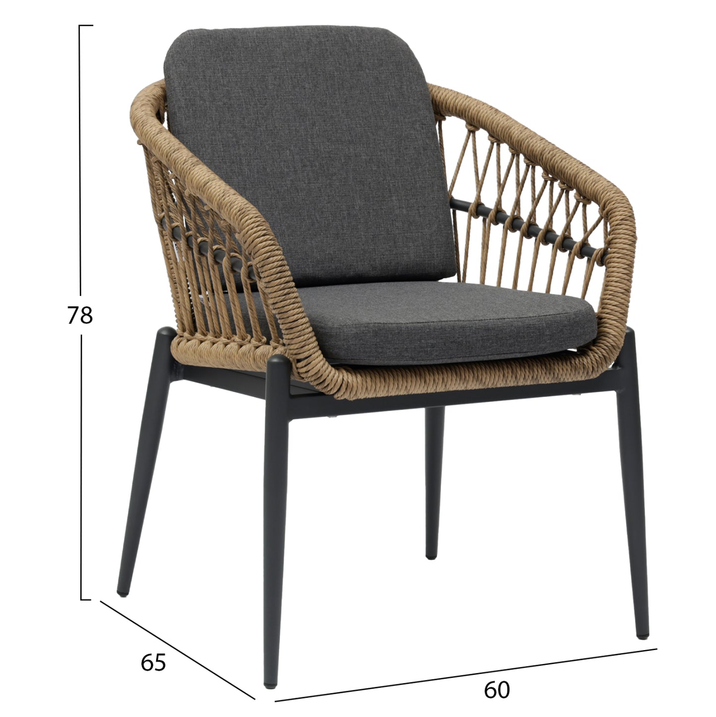 Η πλάτη και το κάθισμα της πολυθρόνας είναι από P.E. Rattan σε πλέξη. Δηλαδή, η πλέξη έχει γίνει με πολυεστερικές ίνες υψηλής ποιότητας και αντοχής ανθεκτικές σε ακραίες καιρικές συνθήκες ζέστης ή κρύου, που μοιάζουν με σχοινί.