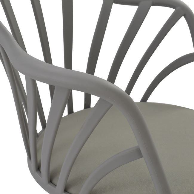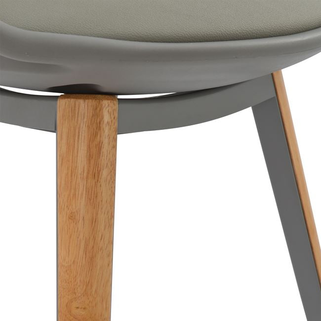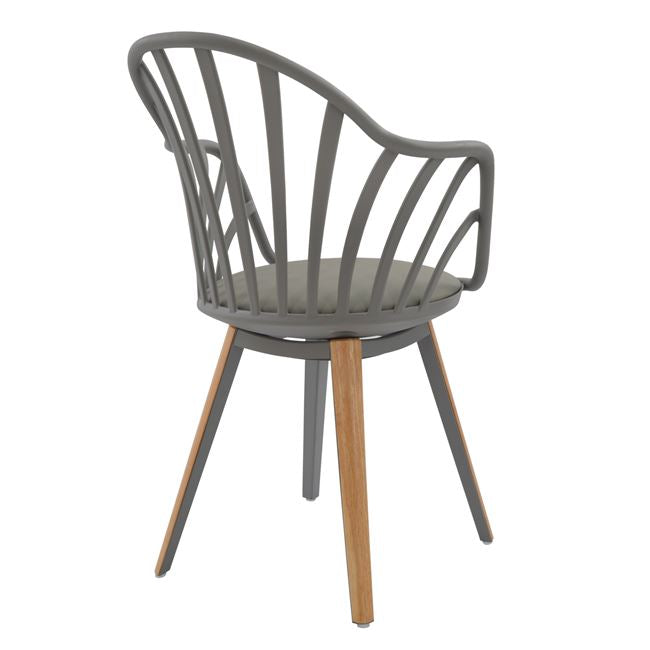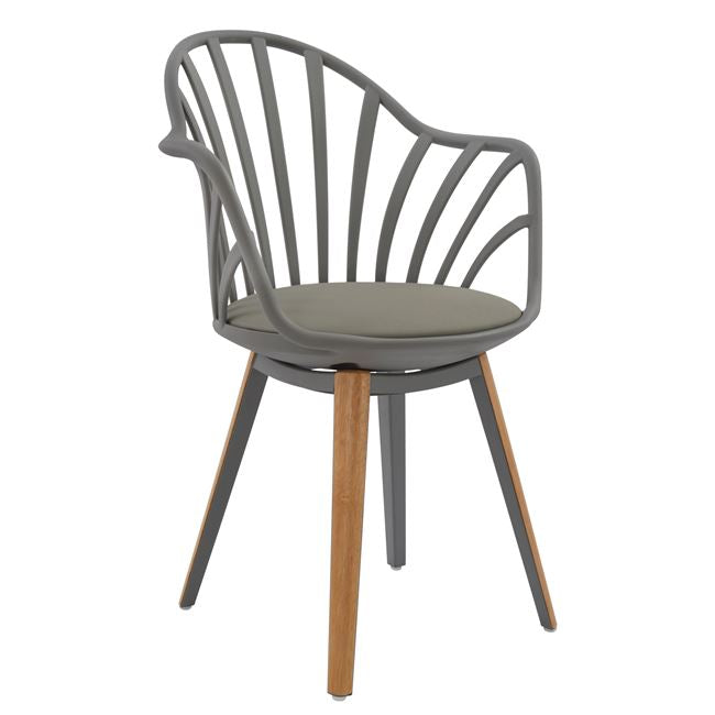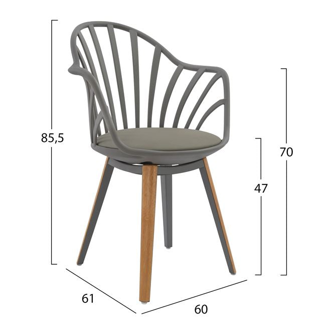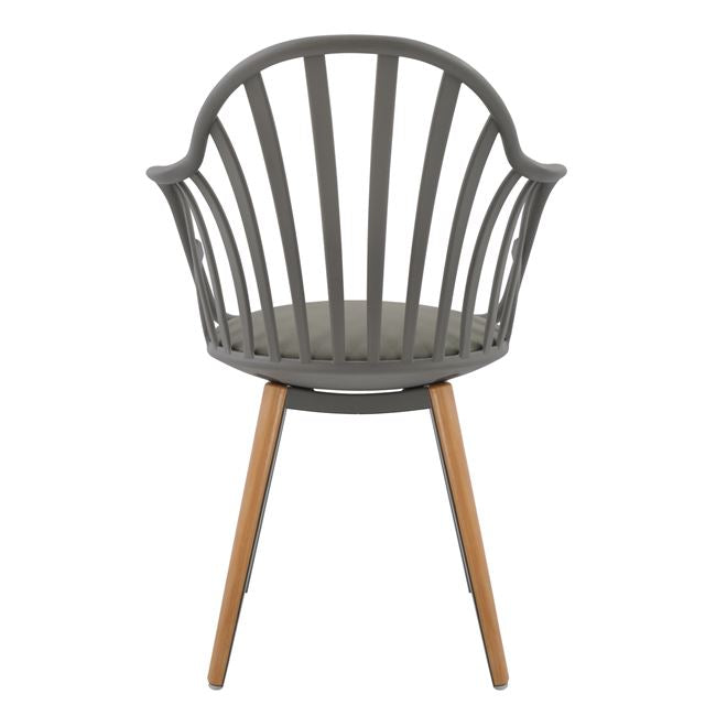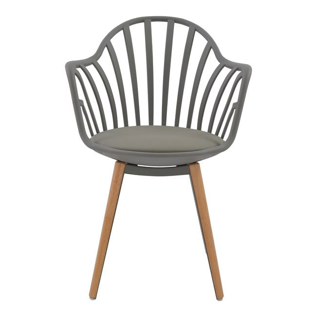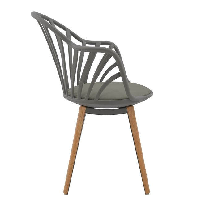 Πολυθρόνα τραπεζαρίας ANAIS, από πολυπροπυλένιο και κάθισμα από PU σε γκρι χρώμα, πόδια εσωτερικά από γκρι μεταλλικό σκελετό και εξωτερικά ντυμένα με ξύλινη επένδυση σε φυσική απόχρωση του ξύλου.
