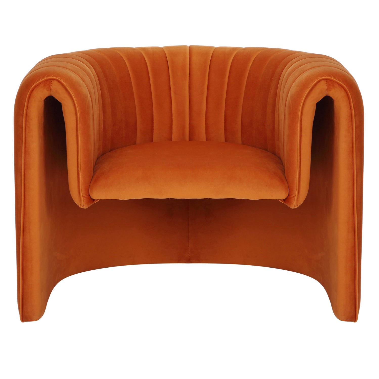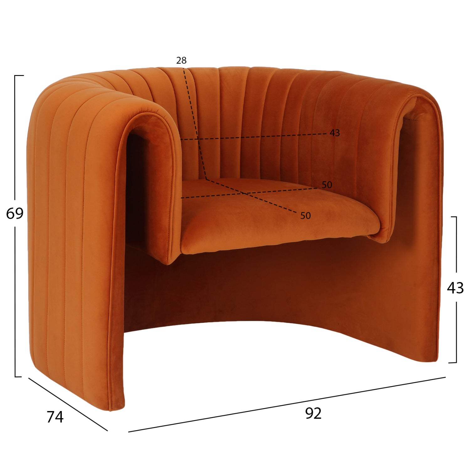 Η πολυθρόνα εσωτερικού χώρου RIKER σε ΠΟΡΤΟΚΑΛΙ χρώμα είναι μοντέρνα και πανέμορφη. Το χαρακτηριστικό που κάνει αυτή την πολυθρόνα να ξεχωρίζει είναι οι καμπύλες του μεταλλικού σκελετού που σχηματίζουν την ημικυκλική πλάτη με τα μπράτσα και όλη η κατασκευή φτάνει μέχρι κάτω δημιουργώντας ουσιαστικά και τα πόδια της πολυθρόνας ως φυσική συνέχεια του design. Μια πολυθρόνα με βελούδινη επένδυση που είναι σίγουρο ότι θα μαγνητίσει το ενδιαφέρον όλων.