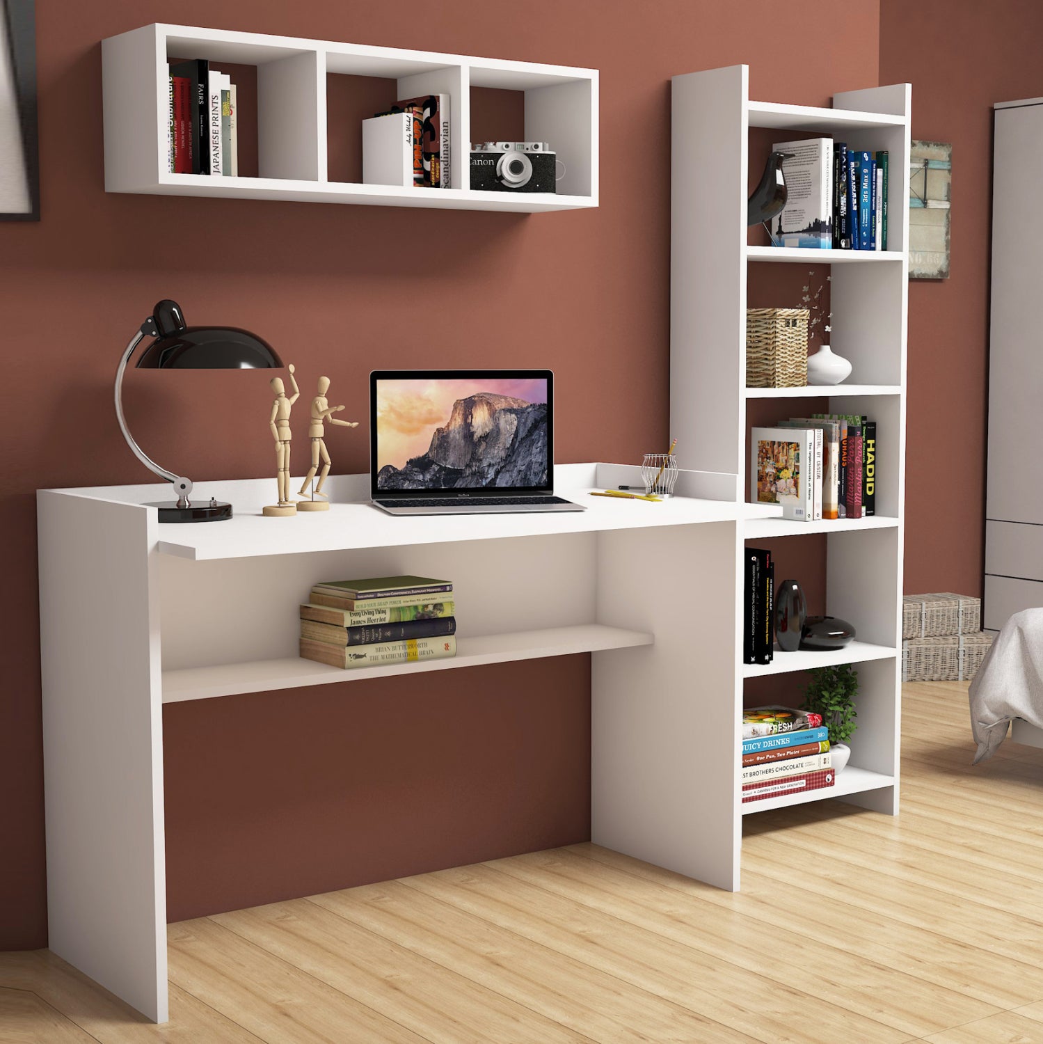 Σετ γραφείου με κομψό και λιτό σχεδιασμό, αποτελούμενο από γραφείο, ραφιέρα τοίχου και βιβλιοθήκη, κατασκευασμένα από ανθεκτική μελαμίνη πάχους 18 χιλιοστών υψηλής ποιότητας, σε λευκή απόχρωση.