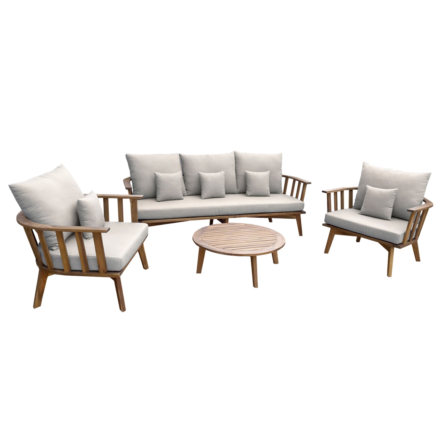 Σας παρουσιάζουμε το όμορφο σετ εξωτερικού χώρου HARRA σε ΦΥΣΙΚΟ χρώμα, με στρογγυλό τραπεζάκι, 2 πολυθρόνες και 1 τριθέσιο καναπέ. Όλο το σετ είναι κατασκευασμένο από ξύλο ΑΚΑΚΙΑΣ. Οι πολυθρόνες και ο καναπές έχουν φαρδύ και κοντό κάθισμα ενώ τα μαξιλάρια σε όλο το σετ είναι επενδυμένα με ποιοτικό P.E. ύφασμα σε ΛΕΥΚΟ χρώμα και διαθέτουν γέμισμα με μέτριας σκληρότητας αφρώδη υλικά για την μεγαλύτερη δυνατή άνεση. Τι άλλο να ζητήσει κανείς για να απολαύσει τον ήλιο;
