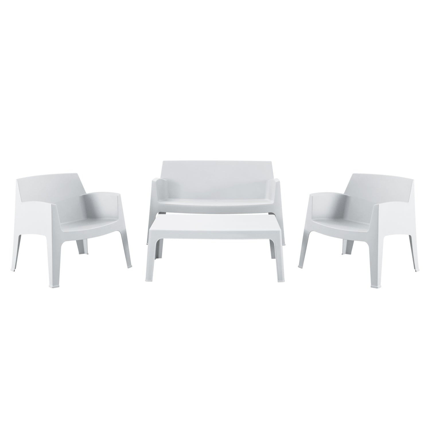 Ένα ορθογώνιο τραπεζάκι, 2 στοιβαζόμενες πολυθρόνες κι έναν 2-θέσιο καναπέ, τα οποία είναι εξολοκλήρου κατασκευασμένα από πολυπροπυλένιο σε ΛΕΥΚΟ χρώμα. Σχεδιαστικά, είναι λιτό και μπορεί να χρησιμοποιηθεί με πολλούς τρόπους προσφέροντας πρακτική και ανθεκτική χρήση. Ιδανική πρόταση για χρήση σε εξωτερικούς χώρους, είτε επαγγελματικούς (χώροι δεξιώσεων, εταιρείες catering, κλπ.) είτε για το σπίτι.