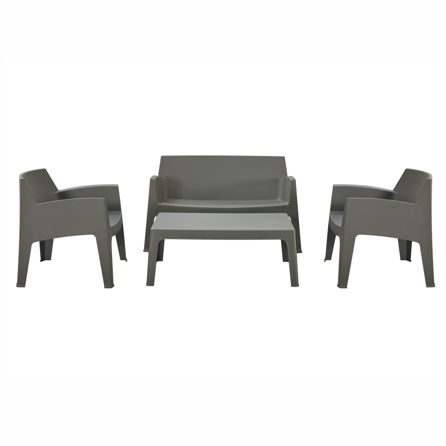 Ένα ορθογώνιο τραπεζάκι, 2 στοιβαζόμενες πολυθρόνες κι έναν 2-θέσιο καναπέ, τα οποία είναι εξολοκλήρου κατασκευασμένα από πολυπροπυλένιο σε DARK OLIVE GREEN χρώμα. Σχεδιαστικά, είναι λιτό και μπορεί να χρησιμοποιηθεί με πολλούς τρόπους προσφέροντας πρακτική και ανθεκτική χρήση. Ιδανική πρόταση για χρήση σε εξωτερικούς χώρους, είτε επαγγελματικούς (χώροι δεξιώσεων, εταιρείες catering, κλπ.) είτε για το σπίτι.