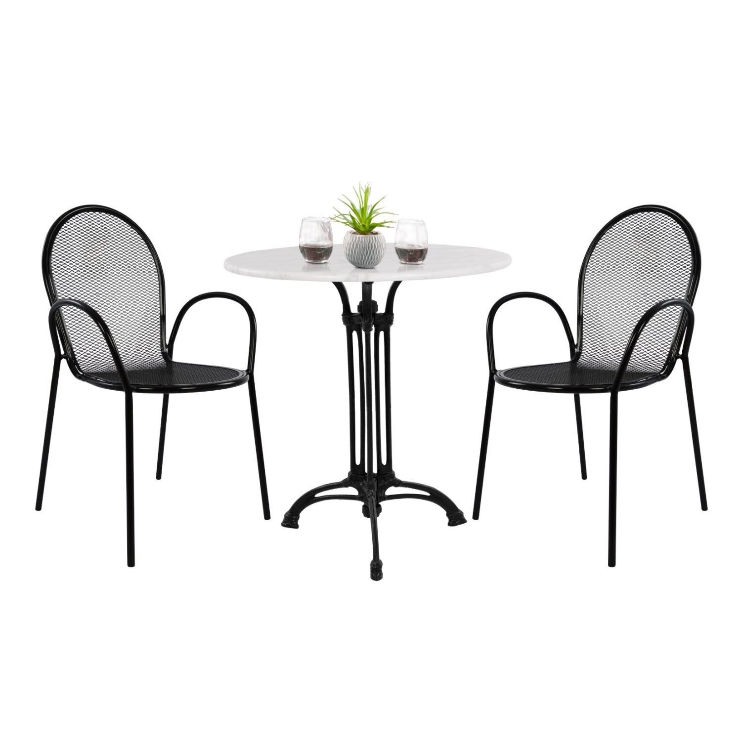 ΗΜ11881—Σετ εξωτερικού χώρου με στρογγυλό 3-νυχο τραπέζι με ΜΑΥΡΟ μαντεμένιο σκελετό και ΛΕΥΚΗ μαρμάρινη επιφάνεια και 2 ΜΑΥΡΕΣ μεταλλικές πολυθρόνες με διάτρητο στυλ.