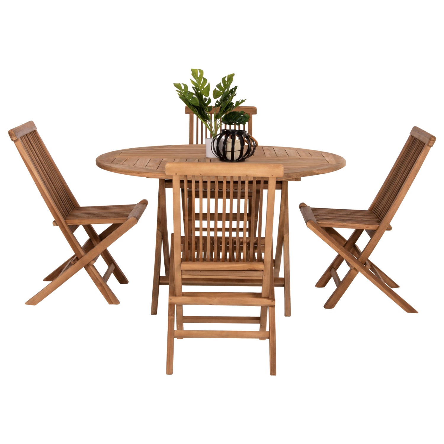 Το σετ τραπεζαρίας 5τμχ KENDALL για εξωτερικούς χώρους είναι πανέμορφο. Αποτελείται από ένα αναδιπλούμενο στρογγυλό τραπέζι κατασκευασμένο από ποιοτικό ξύλο στο ΦΥΣΙΚΟ του χρώμα με ικανοποιητικές διαστάσεις για τουλάχιστον 4 άτομα, και 4 καρέκλες αναδιπλούμενες, όλα από την ίδια σειρά επίπλων. Ιδανικό τόσο για το σπίτι, όσο και για επαγγελματικούς χώρους!