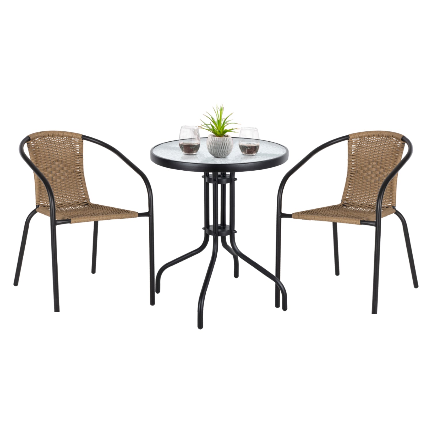 ΗΜ11866.03—Σετ εξωτερικού χώρου με στρογγυλό τραπέζι με ΜΑΥΡΟ μεταλλικό σκελετό και γυάλινη θολή ΕΝΙΣΧΥΜΕΝΗ επιφάνεια και 2 πολυθρόνες μεταλλικές με Rattan σε πλέξη wicker στο κάθισμα και στην πλάτη, σε ΦΥΣΙΚΟ χρώμα.