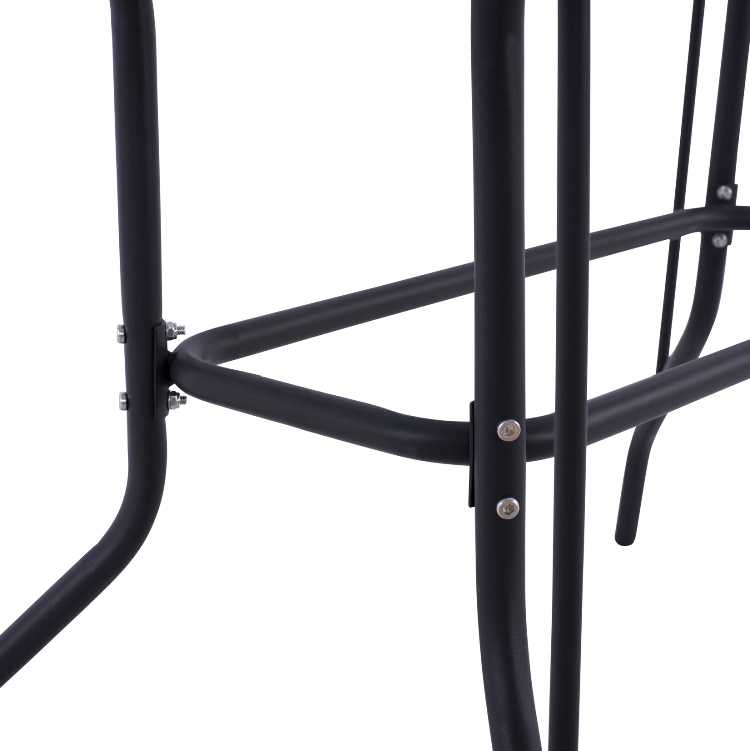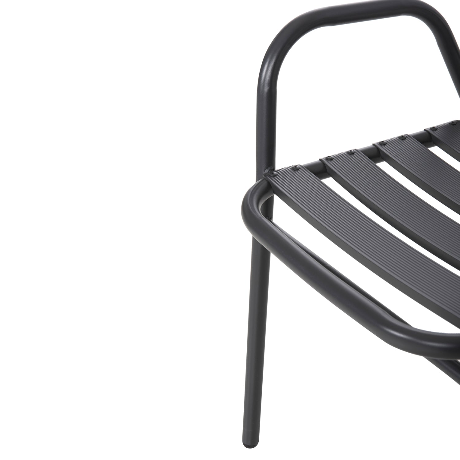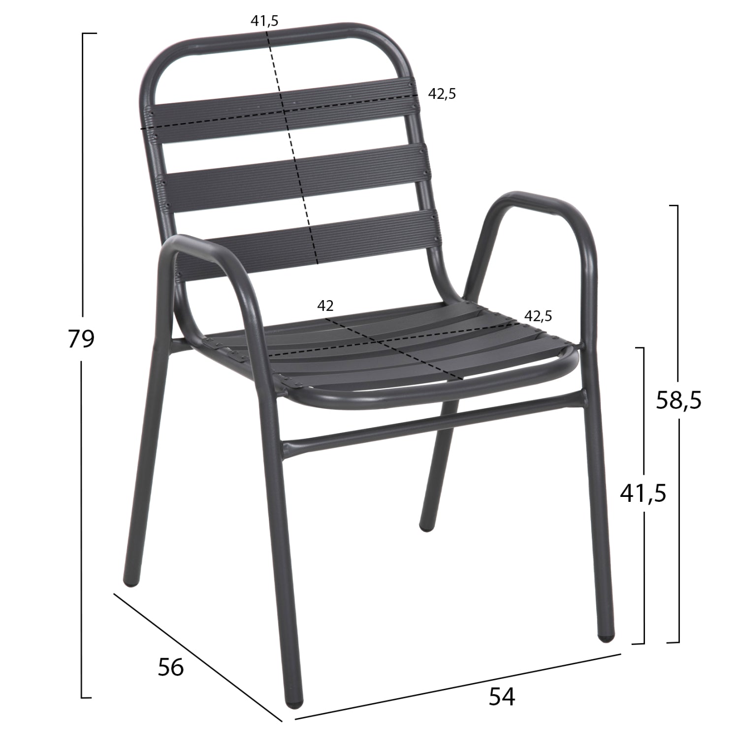 Αυτό το Σετ τραπεζαρίας εξωτερικού χώρου διαθέτει τραπέζι με ΓΚΡΙ μεταλλικό σκελετό και γυάλινη θολή ΕΝΙΣΧΥΜΕΝΗ επιφάνεια, και 4 στοιβαζόμενες μεταλλικές πολυθρόνες με κάθισμα & πλάτη από «φέτες» αλουμινίου σε ΓΚΡΙ χρώμα.