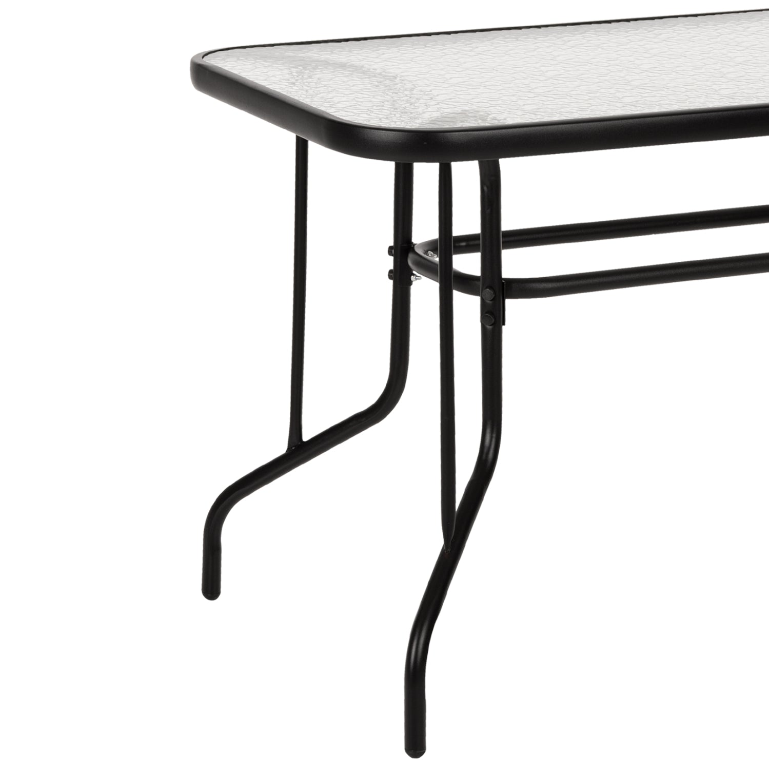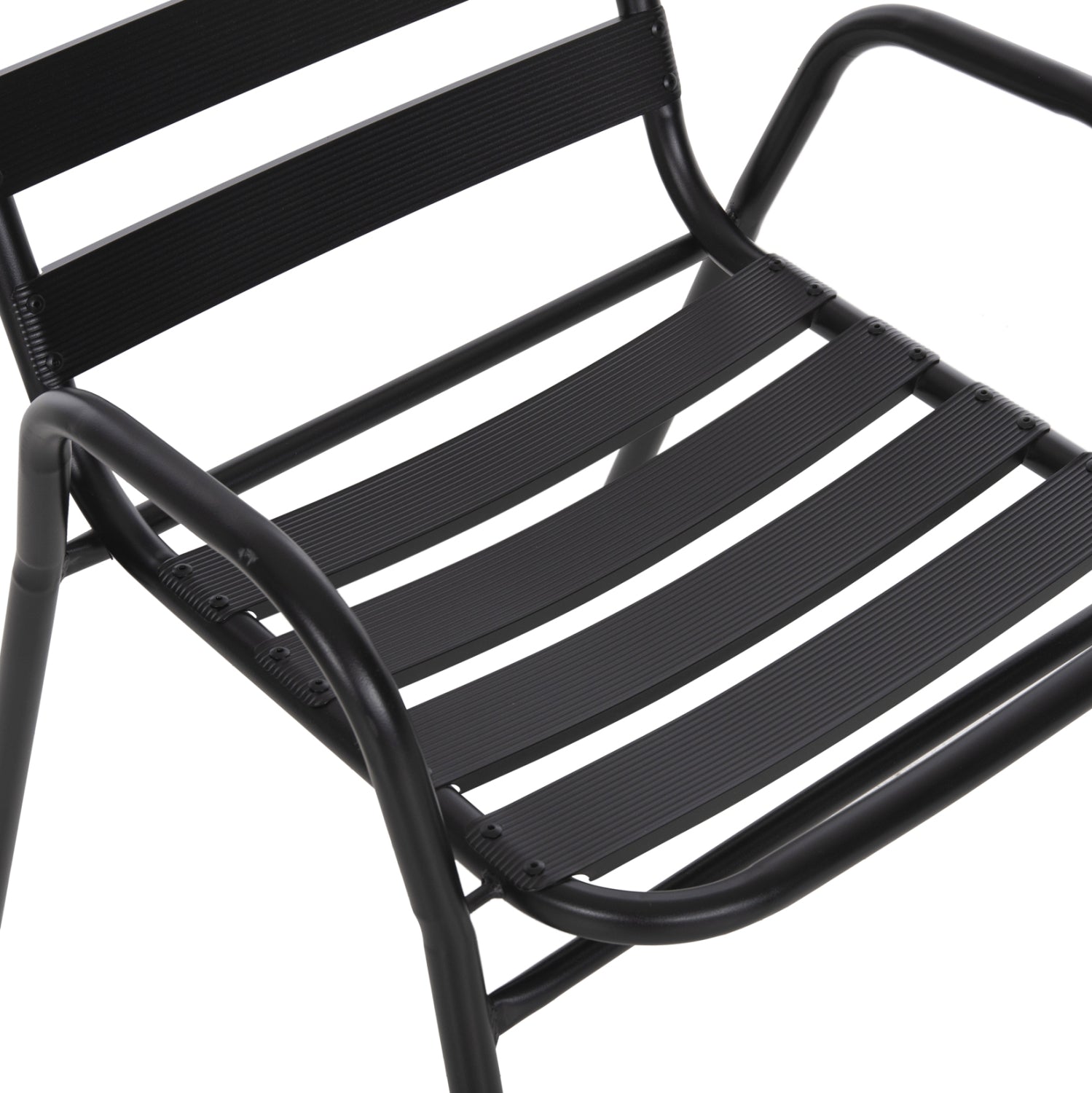 Αυτό το Σετ τραπεζαρίας εξωτερικού χώρου διαθέτει τραπέζι με ΜΑΥΡΟ μεταλλικό σκελετό και γυάλινη θολή ΕΝΙΣΧΥΜΕΝΗ επιφάνεια, και 4 στοιβαζόμενες μεταλλικές πολυθρόνες με κάθισμα & πλάτη από «φέτες» αλουμινίου σε ΜΑΥΡΟ χρώμα.