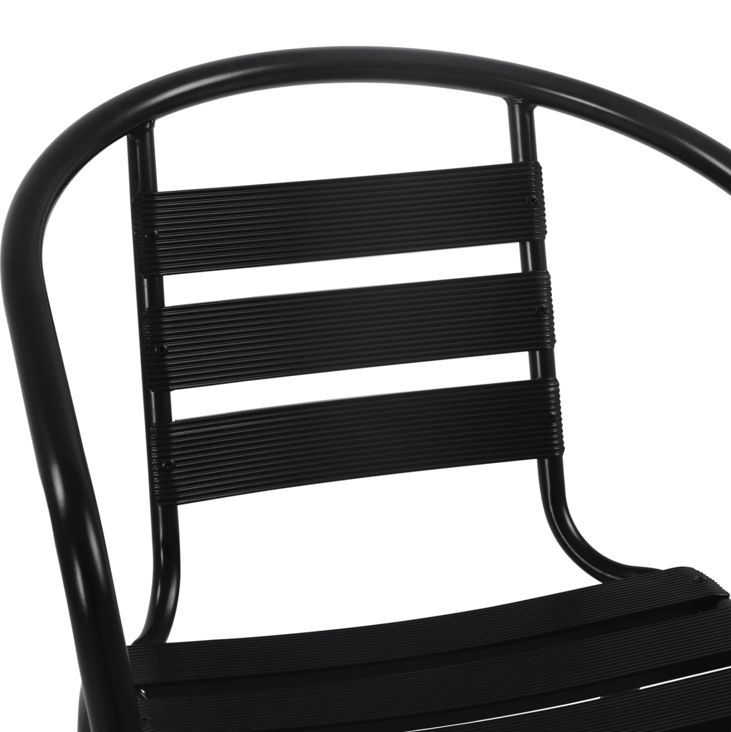 Αυτό το Σετ τραπεζαρίας εξωτερικού χώρου διαθέτει τραπέζι με ΜΑΥΡΟ μεταλλικό σκελετό και γυάλινη θολή ΕΝΙΣΧΥΜΕΝΗ επιφάνεια, και 4 στοιβαζόμενες μεταλλικές πολυθρόνες με κάθισμα & πλάτη από «φέτες» αλουμινίου σε ΜΑΥΡΟ χρώμα.