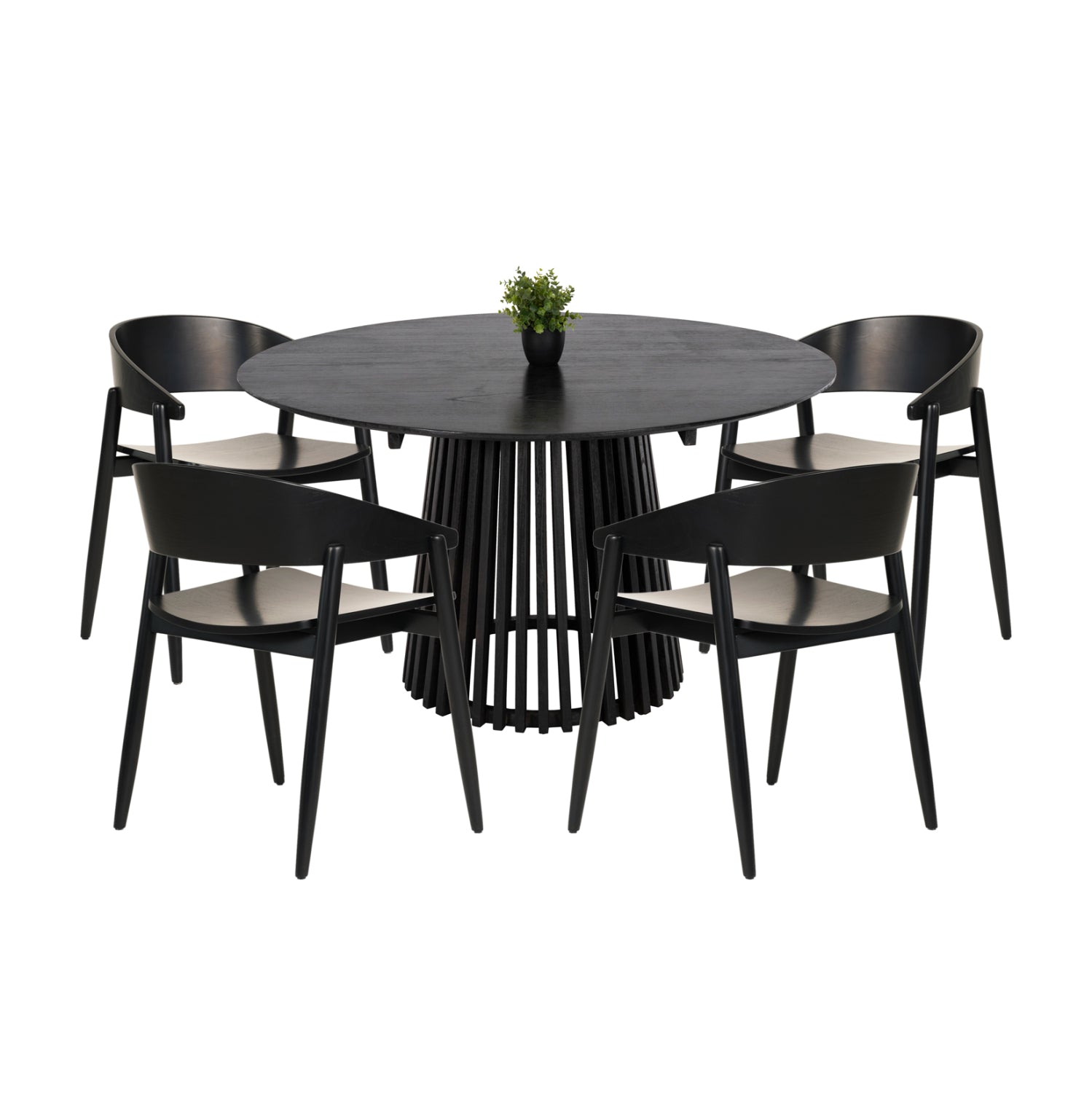 Αυτό το σετ τραπεζαρίας εσωτερικού χώρου 5τμχ αποτελείται από ένα μεγάλο στρογγυλό τραπέζι FRANTZ κατασκευασμένο εξολοκλήρου από ξύλο MINDI σε ΜΑΥΡΟ χρώμα, και από 4 καρέκλες τραπεζαρίας CANOP κατασκευασμένες από ξύλο φράξινου σε ΜΑΥΡΟ χρώμα.