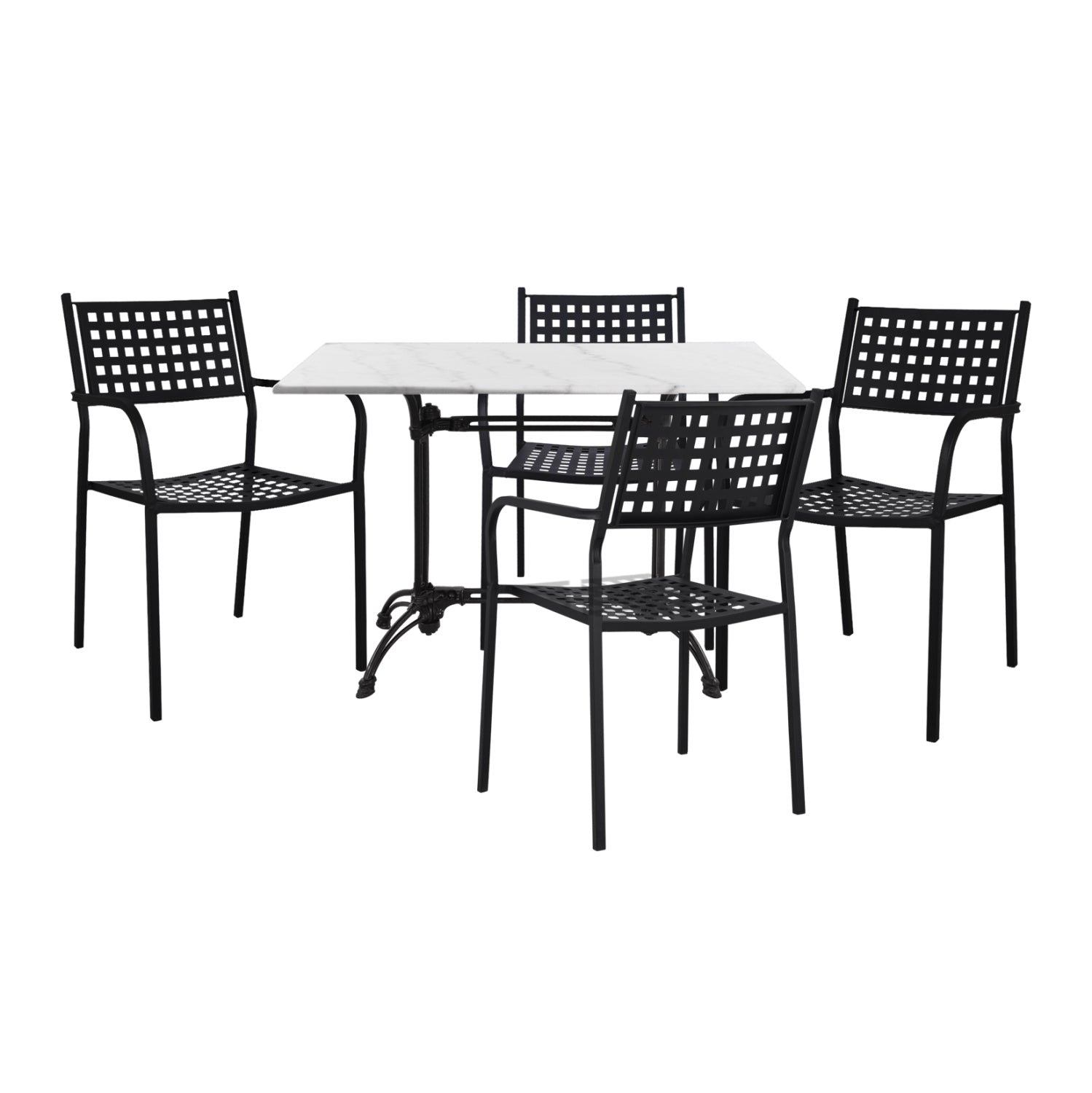 Σετ τραπεζαρίας με τραπέζι και 4 πολυθρόνες. Το τραπέζι είναι διαχρονικής αισθητικής με άσπρη μαρμάρινη επιφάνεια ενώ οι πολυθρόνες είναι μεταλλικές μαύρου χρώματος με καρό σχεδιασμό και ψηλά μπράτσα. Όλο το σετ είναι εξαιρετικά στιβαρό λόγω της βαριάς μεταλλικής κατασκευής και φυσικά το μαρμάρινο τραπέζι είναι η διαχρονικότερη και κλασική επιλογή για τραπέζι εξωτερικού χώρου σε συνδυασμό με τις μεταλλικές πολυθρόνες, είτε για επαγγελματίες είτε για το σπίτι.