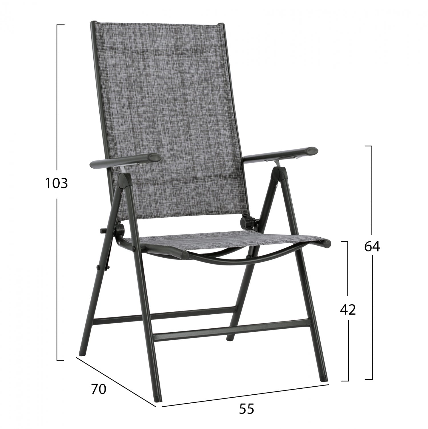 Έξι μοντέρνες πτυσσόμενες πολυθρόνες εξωτερικού χώρου κατασκευασμένες από μεταλλικό σκελετό σε γκρί απόχρωση