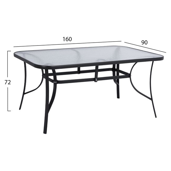 Ένα τραπέζι μεταλλικό εξωτερικού χώρου σε γκρι απόχρωση, με ενσωματωμένο τζάμι ασφαλείας (secure).