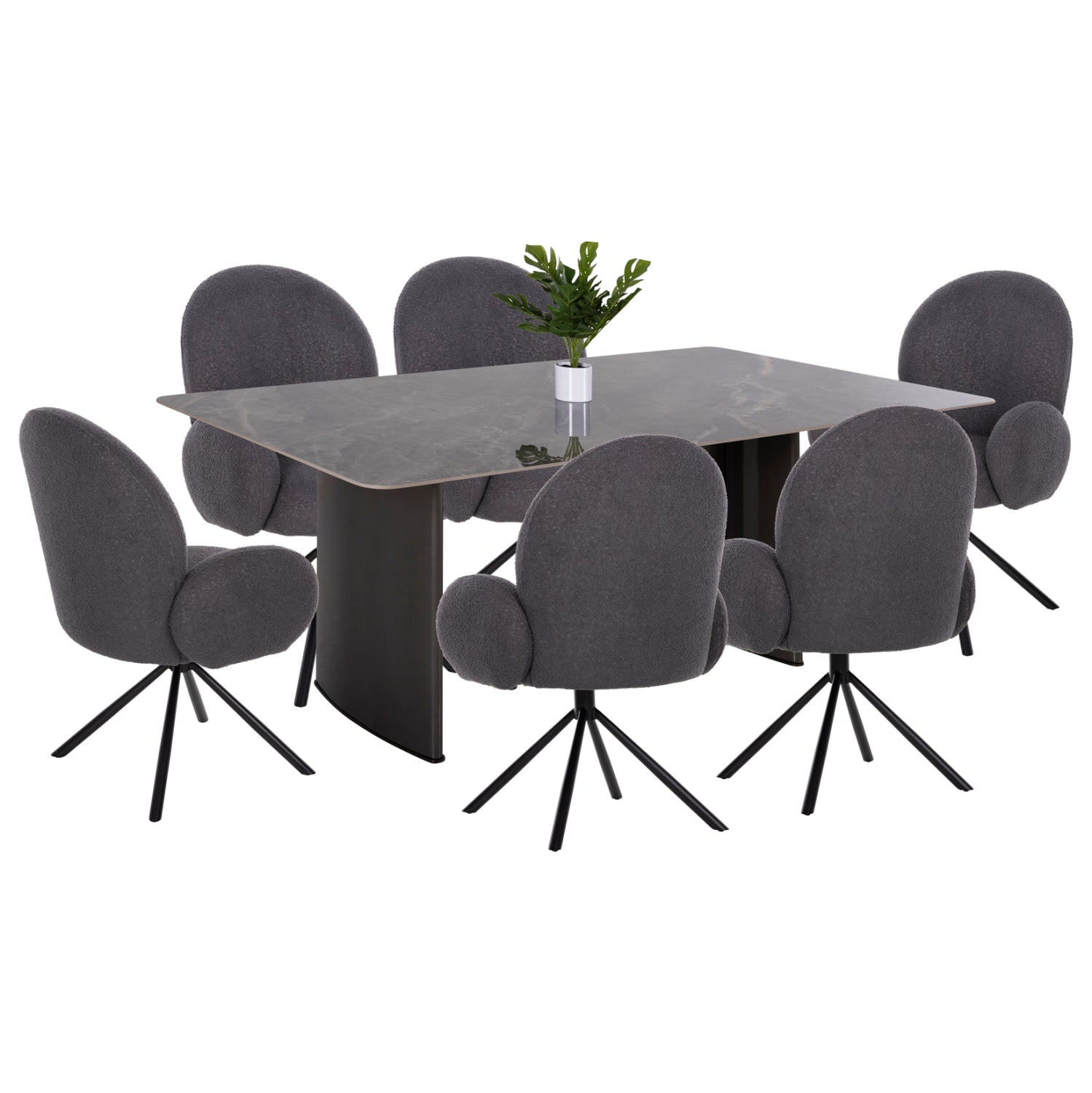 Αυτό το σετ τραπεζαρίας εσωτερικού χώρου αποτελείται από ένα τραπέζι HEFF και 6 πολυθρόνες WINON με ύφασμα TEDDY. Το HEFF είναι ένα μεγάλο τραπέζι τραπεζαρίας σε ορθογώνιο σχήμα. Η επιφάνεια είναι κεραμική από σχιστόλιθο υψηλής ποιότητας σε χρωματισμό ΜΑΥΡΟΥ ΜΑΡΜΑΡΟΥ, ενώ τα πόδια είναι μεταλλικά σε ΜΑΥΡΟ χρώμα. Οι πολυθρόνες WINON είναι σε ΣΚΟΥΡΟ ΓΚΡΙ χρώμα, ενώ στηρίζονται σε μια μαύρη μεταλλική σαγρέ τετράνυχη βάση στην οποία είναι τοποθετημένος ο πίρος περιστροφής, καθώς οι πολυθρόνες περιστρέφεται κατά 180 μοίρες, και διαθέτει αυτόματη επαναφορά στην αρχική της θέση.