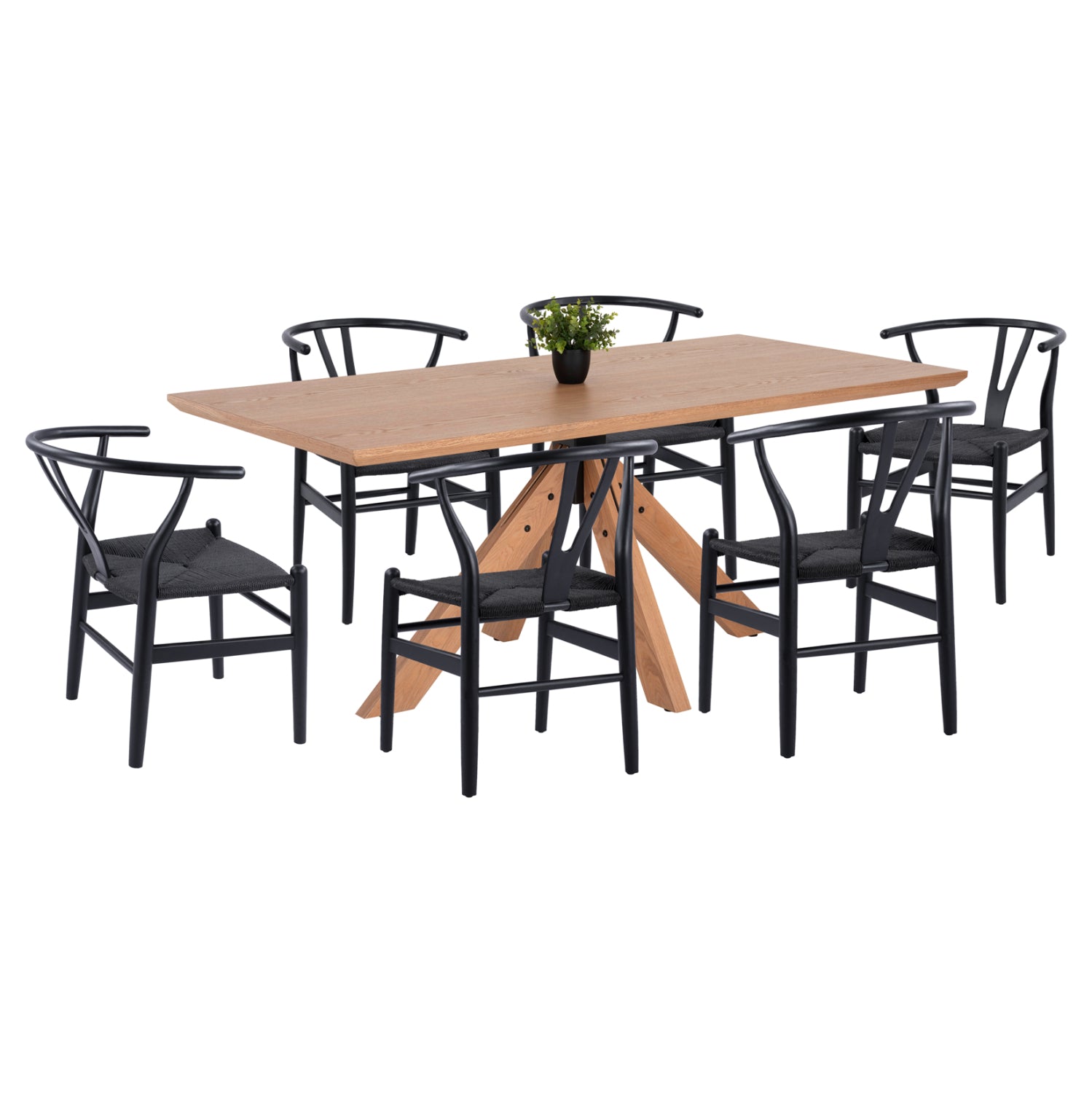 Αυτό το σετ τραπεζαρίας εσωτερικού χώρου αποτελείται από ένα τραπέζι και 6 καρέκλες. Το τραπέζι είναι μεγάλο σε ορθογώνιο σχήμα. Η επιφάνεια είναι από MDF με καπλαμά από Manchurian wood (είδος φράξου) σε χρώμα ΦΥΣΙΚΟ ΔΡΥΟΣ. Η φαλτσοκομμένη επιφάνεια αυτή, στηρίζεται σε μια μαύρη μεταλλική βάση/κολώνα στην οποία μοντάρονται 4 πόδια από μασίφ rubberwood, επίσης σε ΦΥΣΙΚΟ χρώμα ΔΡΥΟΣ. Οι καρέκλες είναι από ξύλο οξιάς με κάθισμα από σχοινί. Ολόκληρη η καρέκλα είναι σε ΜΑΥΡΟ χρώμα.