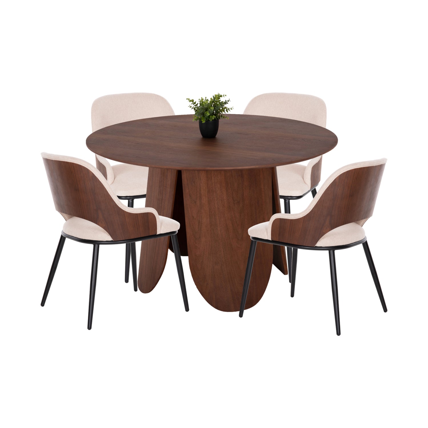 Αυτό το σετ τραπεζαρίας εσωτερικού χώρου αποτελείται από ένα τραπέζι DENTY και 4 καρέκλες DELF. Το DENTY είναι ένα στρογγυλό τραπέζι για την τραπεζαρία, με φαλτσοκομμένη επιφάνεια από MDF με καπλαμά δρυός σε ΚΑΡΥΔΙ χρώμα. Η επιφάνεια αυτή στηρίζεται σε μία πανέμορφη ξύλινη κυλινδρική βάση με ίδιο χρωματισμό. Οι καρέκλες DELF έχουν επένδυση με ύφασμα σε ΜΠΕΖ απόχρωση και ΜΑΥΡΑ μεταλλικά πόδια. Αυτό, όμως, που ξεχωρίζει είναι ότι ολόκληρη η πλάτη είναι ξύλινη σε ΚΑΡΥΔΙ χρώμα κι είναι κυρτή και αναπαυτική.