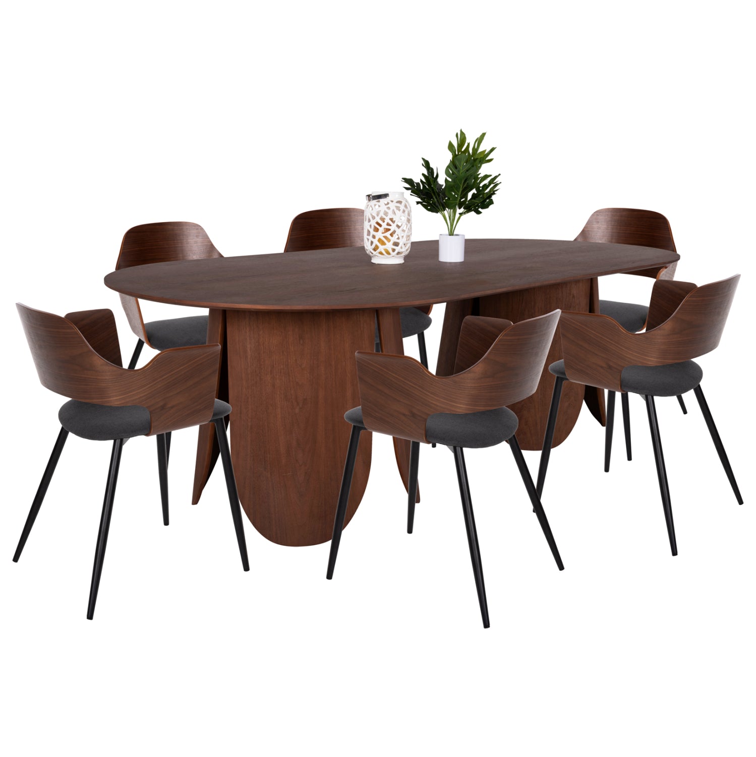 Αυτό το σετ τραπεζαρίας εσωτερικού χώρου αποτελείται από ένα τραπέζι DENTY και 6 καρέκλες VELP. Το DENTY είναι ένα μεγάλο οβάλ τραπέζι για την τραπεζαρία, με φαλτσοκομμένη επιφάνεια από MDF με καπλαμά δρυός σε ΚΑΡΥΔΙ χρώμα. Η επιφάνεια αυτή στηρίζεται σε 2 πανέμορφες ξύλινες κυλινδρικές βάσεις με ίδιο χρωματισμό. Οι καρέκλες VELP έχουν κάθισμα σε ΓΚΡΙ απόχρωση και ΜΑΥΡΑ μεταλλικά πόδια. Αυτό, όμως, που ξεχωρίζει είναι ότι ολόκληρη η πλάτη είναι ξύλινη σε ΚΑΡΥΔΙ χρώμα κι είναι κυρτή και αναπαυτική.