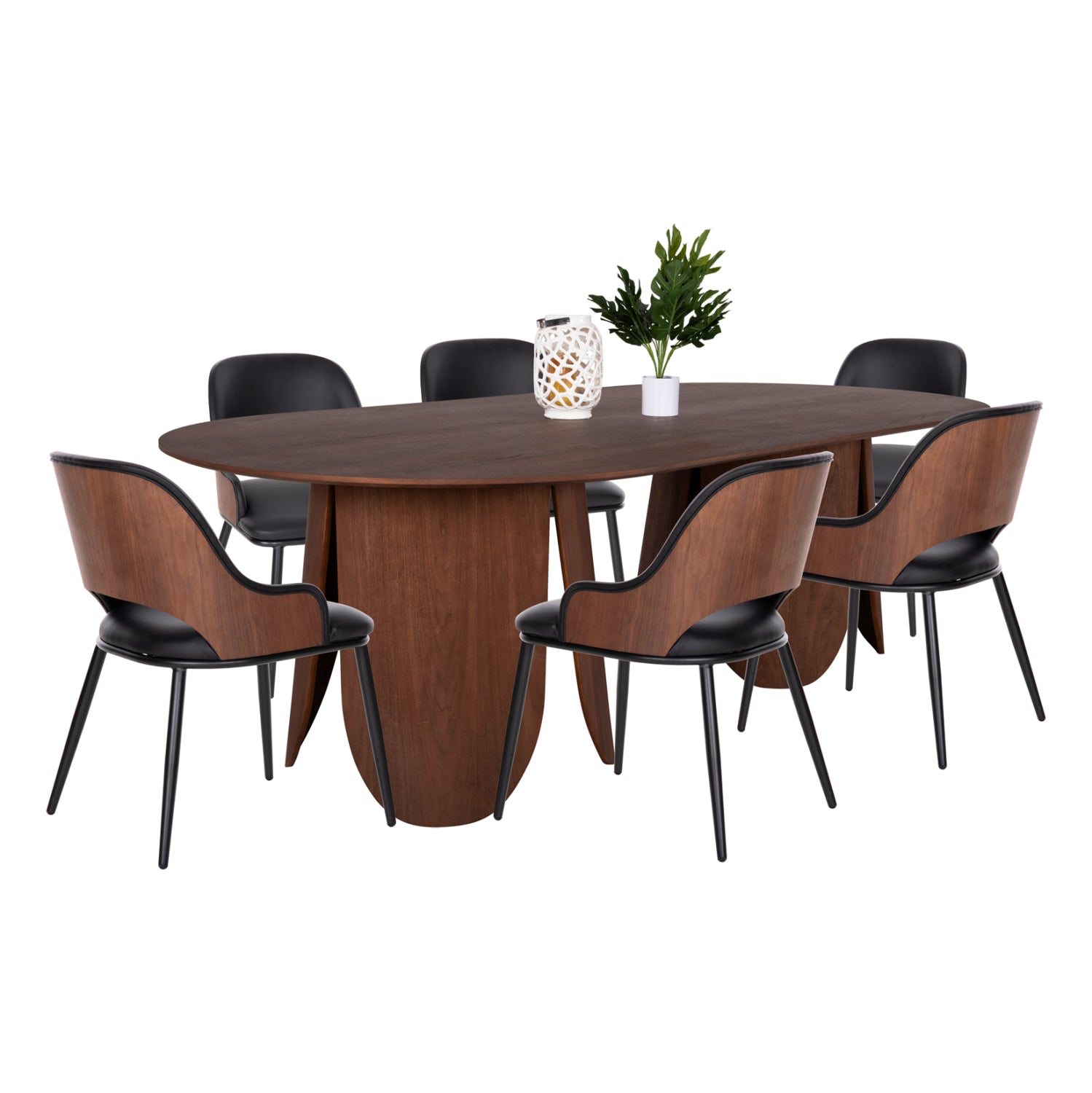 Αυτό το σετ τραπεζαρίας εσωτερικού χώρου αποτελείται από ένα τραπέζι DENTY και 6 καρέκλες DELF. Το DENTY είναι ένα μεγάλο οβάλ τραπέζι για την τραπεζαρία, με φαλτσοκομμένη επιφάνεια από MDF με καπλαμά δρυός σε ΚΑΡΥΔΙ χρώμα. Η επιφάνεια αυτή στηρίζεται σε 2 πανέμορφες ξύλινες κυλινδρικές βάσεις με ίδιο χρωματισμό. Οι καρέκλες DELF έχουν κάθισμα και πλάτη από PU σε ΜΑΥΡΗ απόχρωση και ΜΑΥΡΑ μεταλλικά πόδια. Αυτό, όμως, που ξεχωρίζει είναι ότι ολόκληρη η πλάτη είναι ξύλινη σε ΚΑΡΥΔΙ χρώμα κι είναι κυρτή και αναπαυτική.