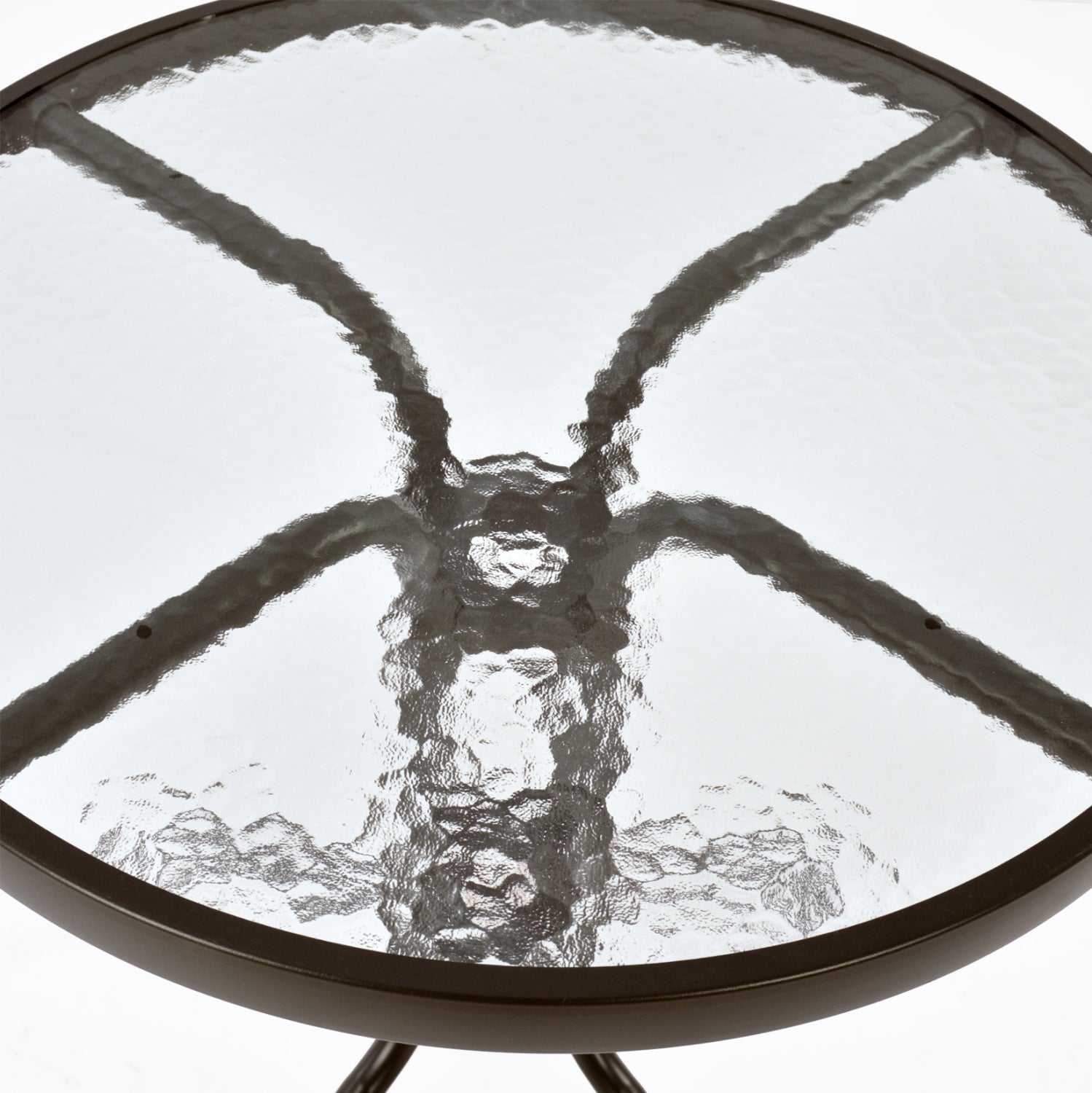 Ένα τραπέζι μεταλλικό εξωτερικού χώρου σε χρώμα καφέ , με ενσωματωμένο τζαμί ασφάλειας (secure).