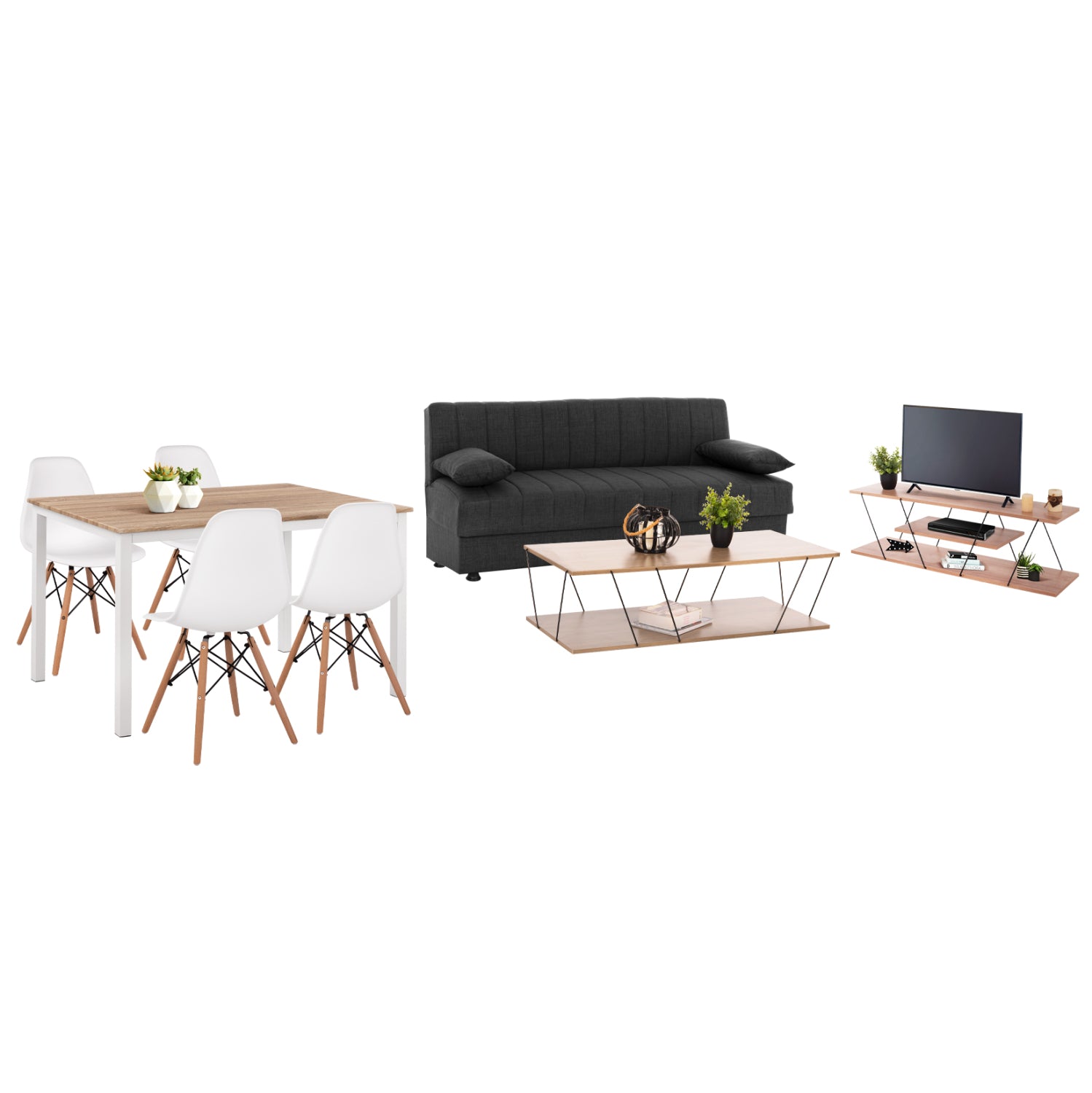 Αυτό το σετ περιλαμβάνει καναπέ, τραπέζι σαλονιού, έπιπλο TV, τραπέζι κουζίνας, και καρέκλα τραπεζαρίας.