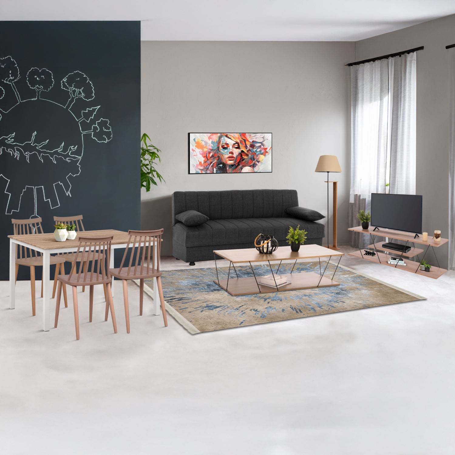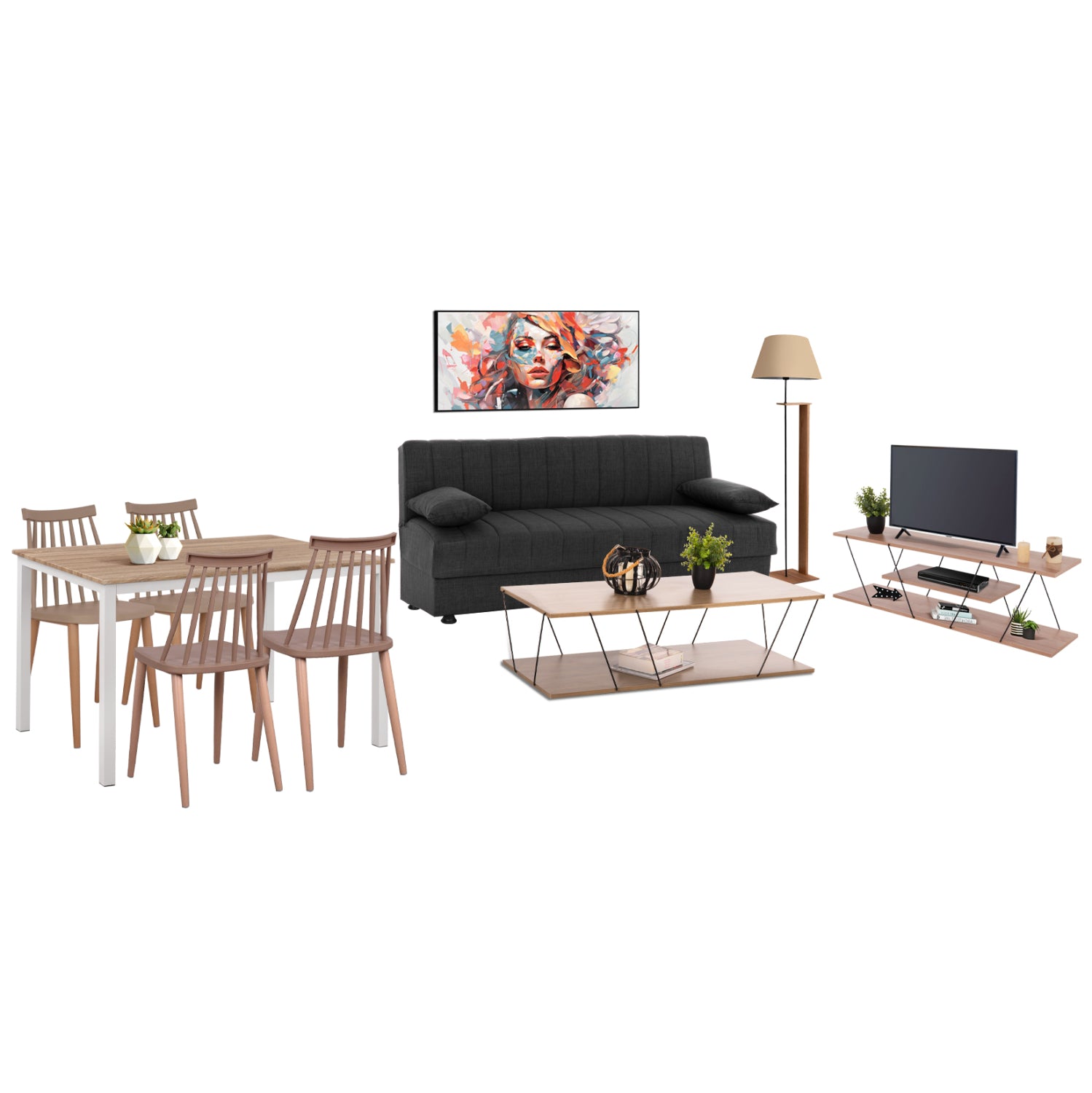 Αυτό το σετ περιλαμβάνει καναπέ-κρεβάτι, τραπέζι σαλονιού, έπιπλο τηλεόρασης, φωτιστικό δαπέδου, τραπέζι κουζίνας, 4 καρέκλες, και πίνακας τοίχου!