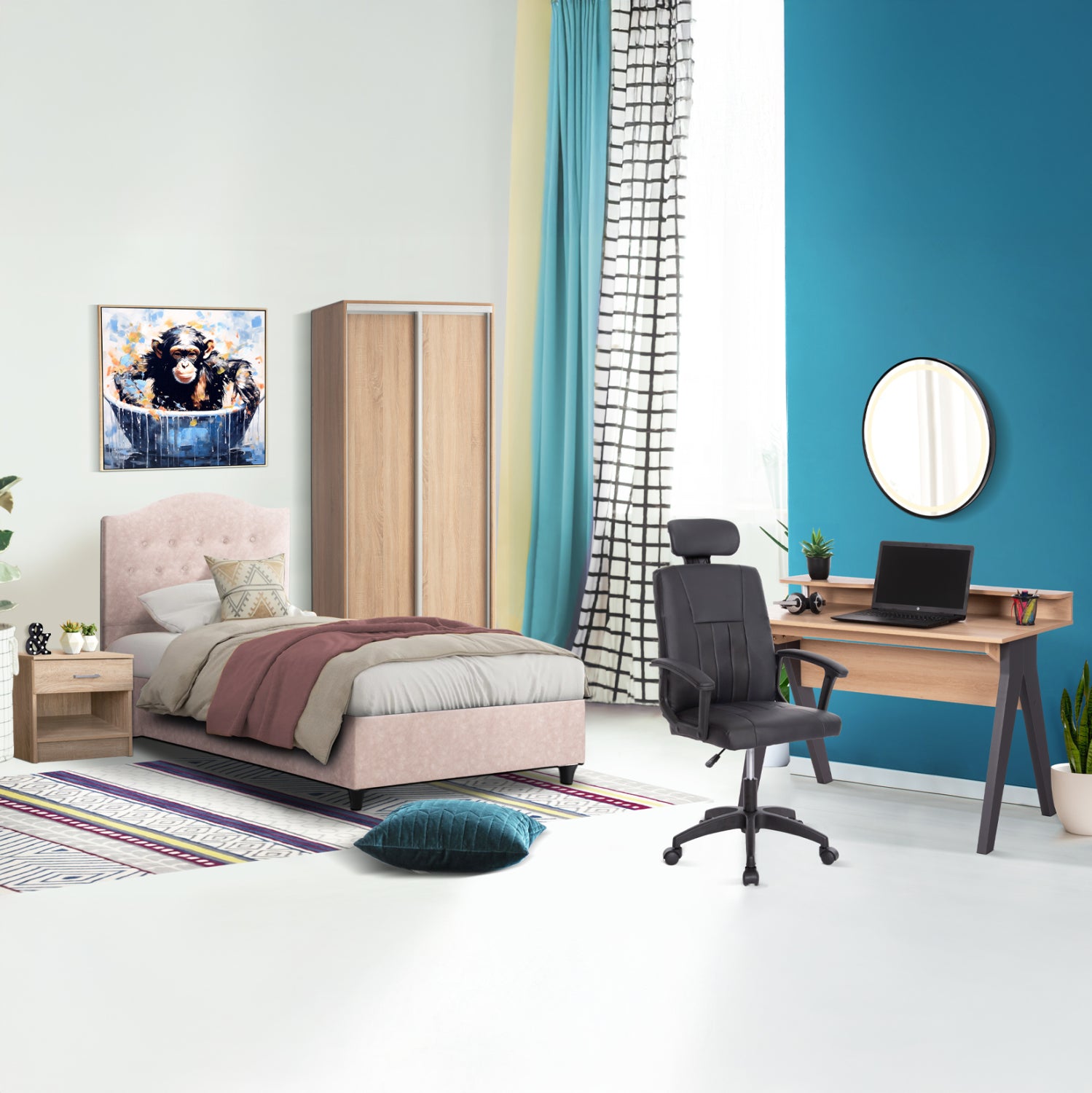 Αυτό το σετ περιλαμβάνει ένα κομοδίνο, ένα κρεβάτι, μια ντουλάπα, μια καρέκλα γραφείου, και ένα γραφείο! Αναλυτικά:
