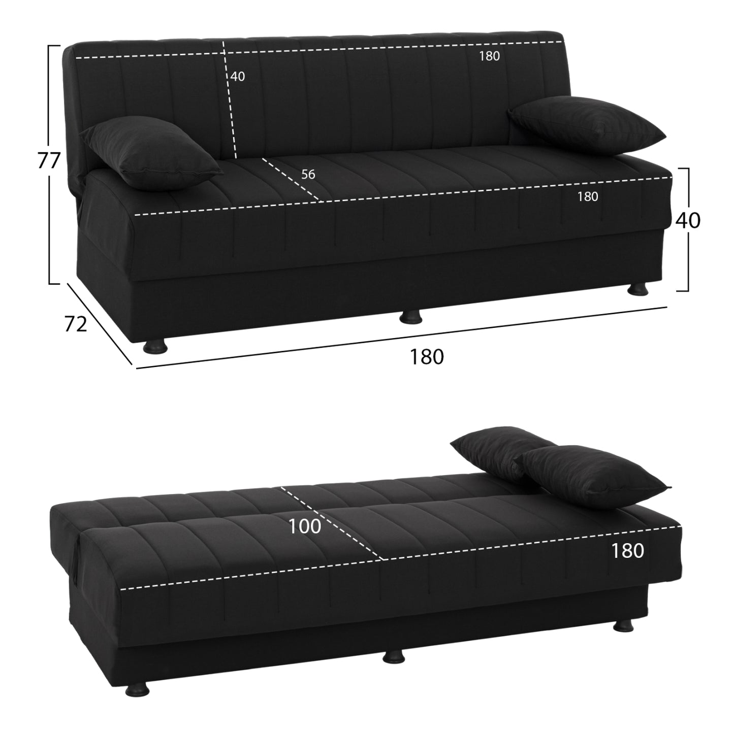 Καναπές τριθέσιος με μαύρο ύφασμα, που γίνεται κρεβάτι με μηχανισμό που ρίχνει την πλάτη. Διαστάσεις: 180x72x77Y εκ.