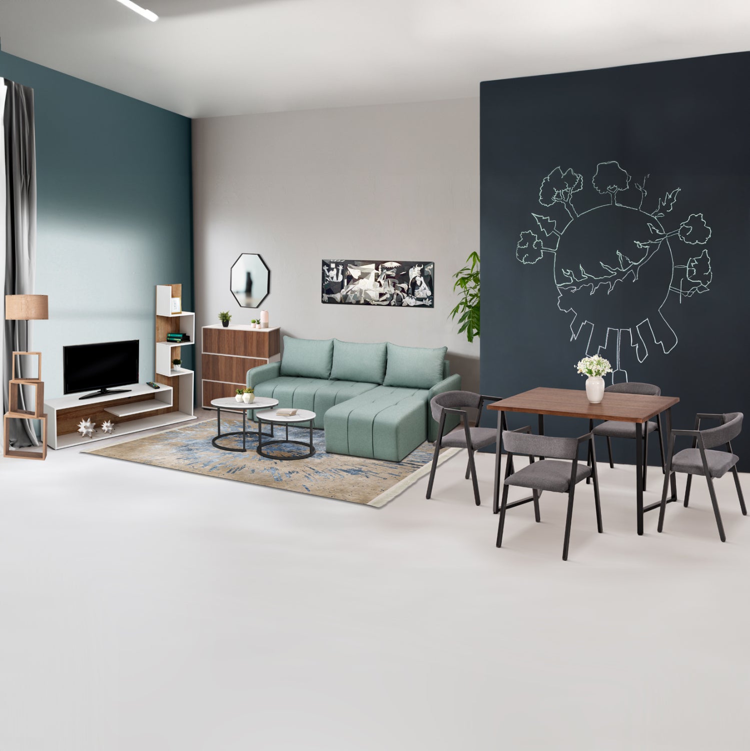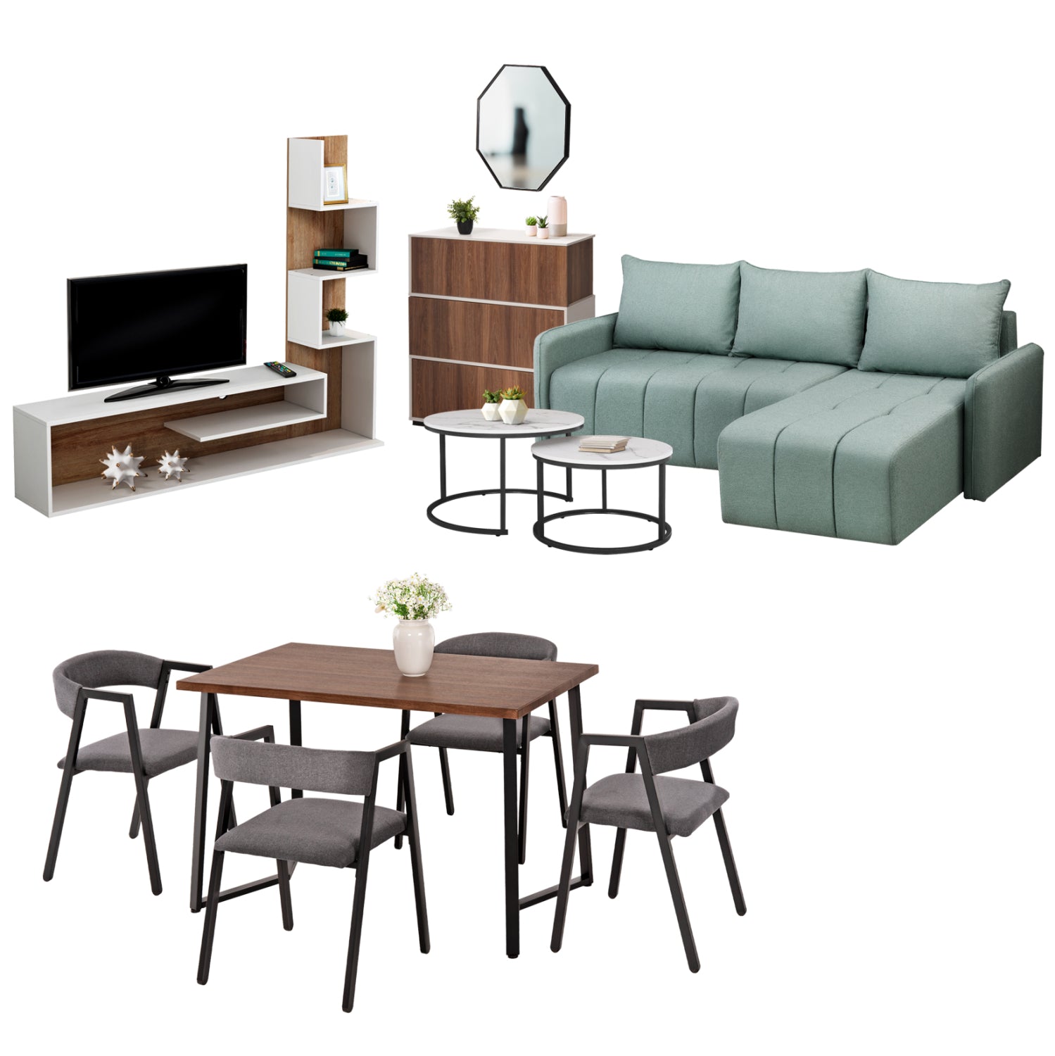 Αυτό το σετ περιλαμβάνει παπουτσοθήκη 3 θέσεων, τραπέζι σαλονιού, σετ τραπεζαρίας με 4 καρέκλες, καθρέπτη τοίχου, έπιπλο TV, και γωνιακό καναπέ-κρεβάτι με αποθηκευτικό χώρο!