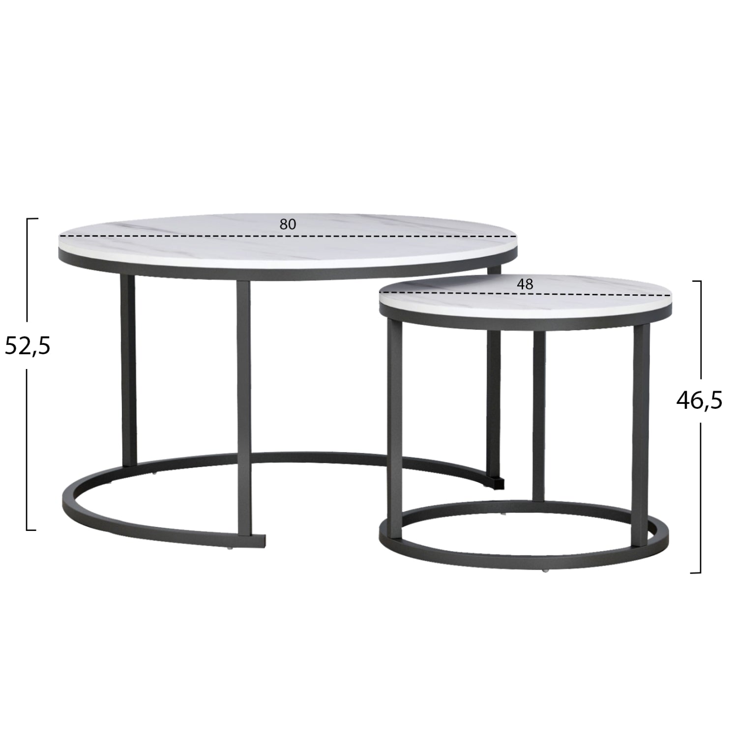 Σετ ζιγκόν 2 τραπεζάκια σαλονιού στρογγυλά από MDF σε χρώμα ΛΕΥΚΟ ΜΑΡΜΑΡΟ και ΜΑΥΡΑ μεταλλικά πόδια.