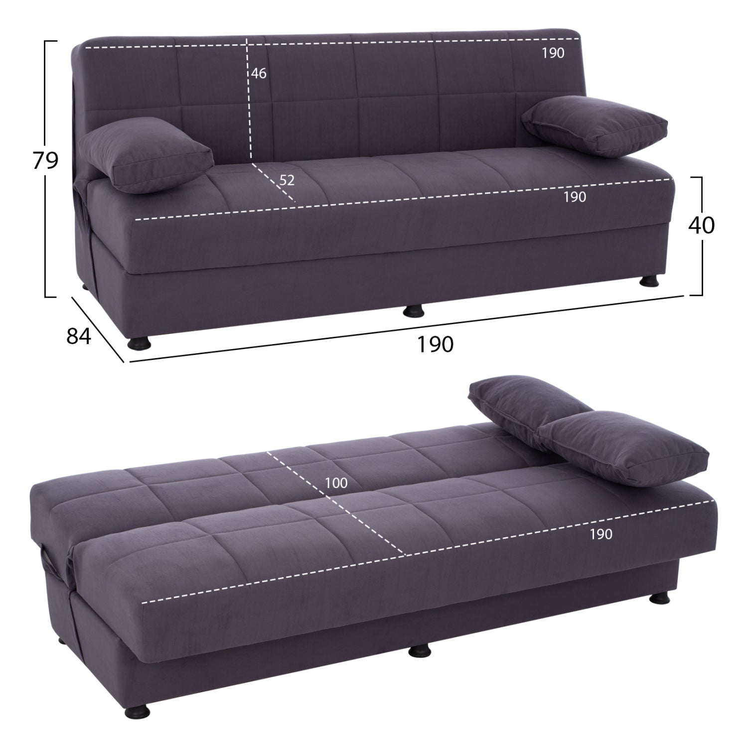 3θέσιος καναπές με γκρι ύφασμα που γίνεται κρεβάτι όταν «πέφτει» η πλάτη. Διαστάσεις: 190x84x79Y εκ.