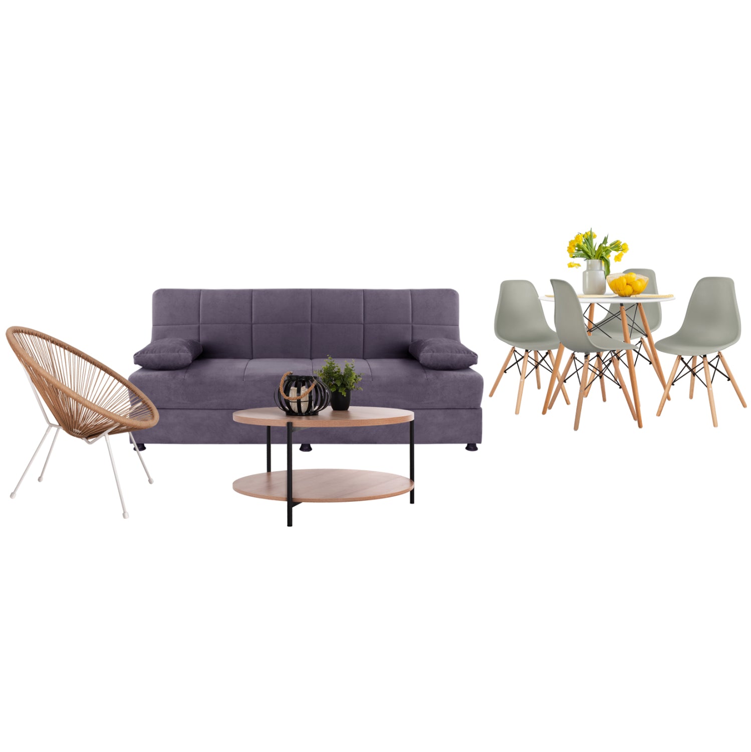Αυτό το σετ περιλαμβάνει καναπέ-κρεβάτι, πολυθρόνα-φωλιά, τραπέζι σαλονιού, τραπέζι κουζίνας, καρέκλες 4τμχ!