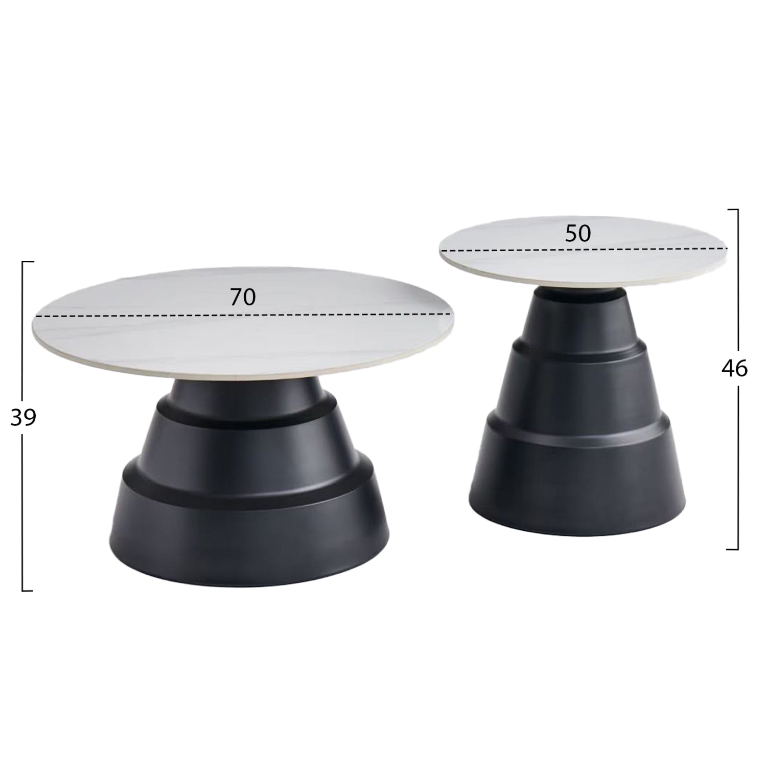 Αυτό το σετ τραπεζιών για το σαλόνι αποτελείται από 2 μεταλλικά τραπεζάκια στρογγυλά διαφορετικών μεγεθών. Οι βάσεις τους έχουν σχήμα διαβαθμισμένου κώνου σε ΜΑΥΡΟ χρώμα, ενώ οι επιφάνειες είναι κατασκευασμένες από γυαλιστερό sintered stone σε χρωματικό σχήμα SNOW WHITE. Ιδανικά τόσο για το σπίτι, όσο και για επαγγελματικούς χώρους.