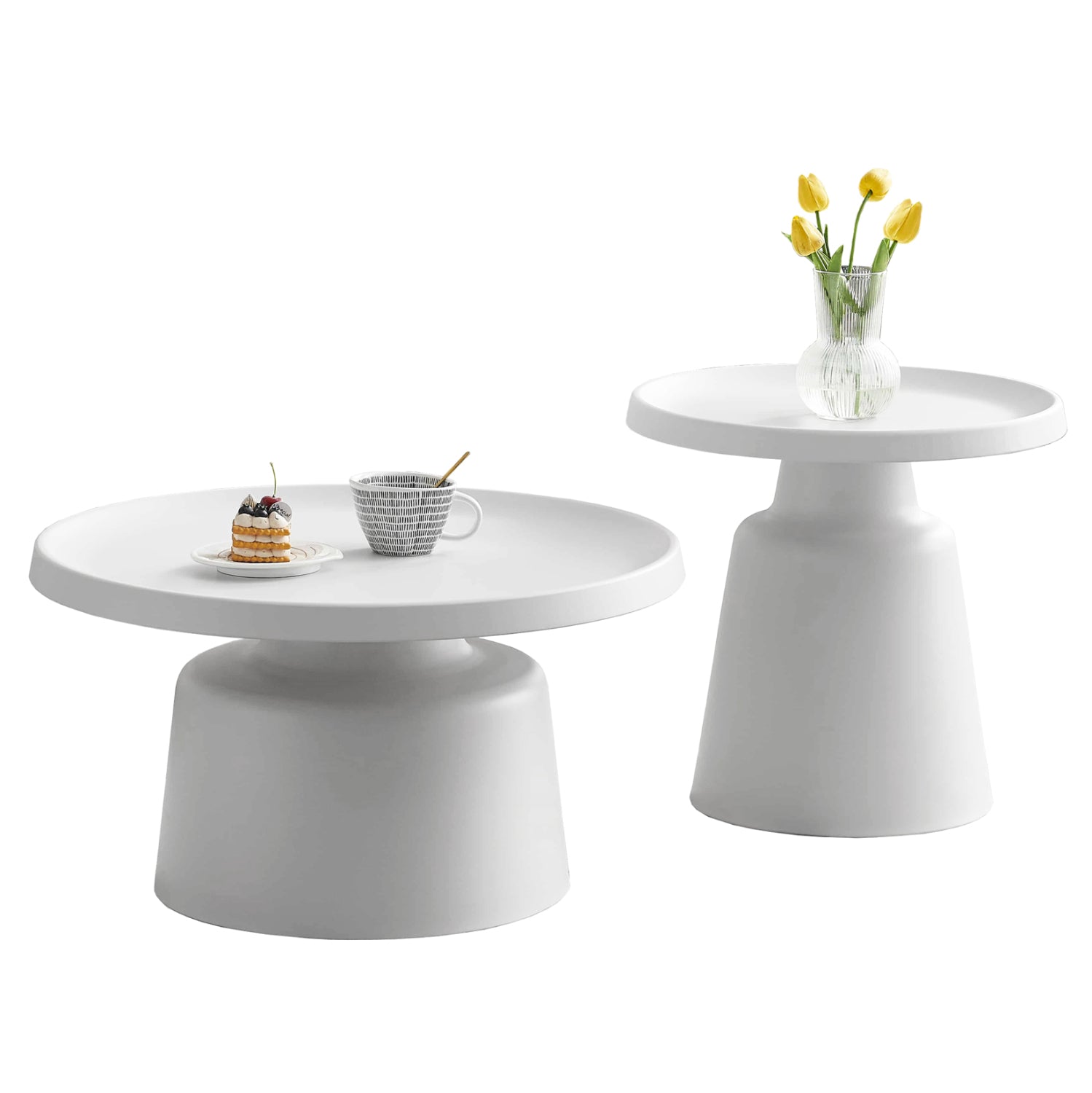 Αυτό το σετ 2 τραπεζιών για το σαλόνι είναι πανέμορφο και πρακτικότατο. Πρόκειται για 2 εξολοκλήρου μεταλλικά τραπεζάκια στρογγυλά διαφορετικών μεγεθών σε ΛΕΥΚΟ χρώμα. Το ένα έχει κωνική βάση που καταλήγει σε όμορφο «λαιμό», και το άλλο έχει κυλινδρική σχεδόν βάση. Ιδανικά τόσο για το σπίτι, όσο και για επαγγελματικούς χώρους.