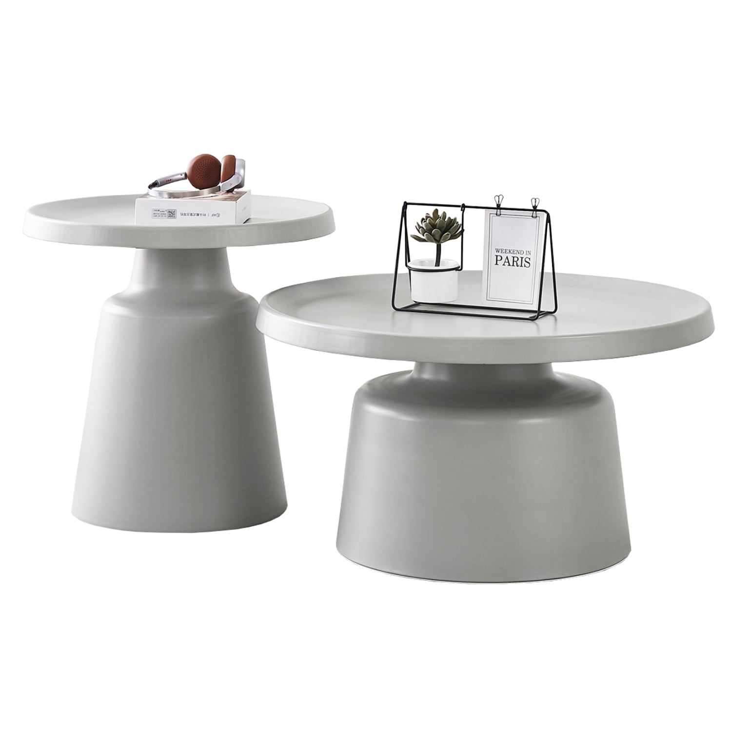 Αυτό το σετ 2 τραπεζιών για το σαλόνι είναι πανέμορφο και πρακτικότατο. Πρόκειται για 2 εξολοκλήρου μεταλλικά τραπεζάκια στρογγυλά διαφορετικών μεγεθών σε ΓΚΡΙ χρώμα. Το ένα έχει κωνική βάση που καταλήγει σε όμορφο «λαιμό», και το άλλο έχει κυλινδρική σχεδόν βάση. Ιδανικά τόσο για το σπίτι, όσο και για επαγγελματικούς χώρους.