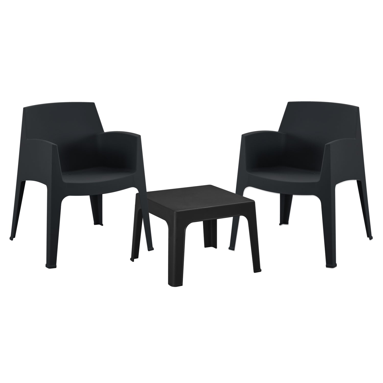 Ένα τετράγωνο τραπεζάκι και 2 στοιβαζόμενες πολυθρόνες, τα οποία είναι εξολοκλήρου κατασκευασμένα από πολυπροπυλένιο σε ΜΑΥΡΟ χρώμα. Σχεδιαστικά, είναι λιτό και μπορεί να χρησιμοποιηθεί με πολλούς τρόπους προσφέροντας πρακτική και ανθεκτική χρήση. Ιδανική πρόταση για χρήση σε εξωτερικούς χώρους, είτε επαγγελματικούς (χώροι δεξιώσεων, εταιρείες catering, κλπ.) είτε για το σπίτι.