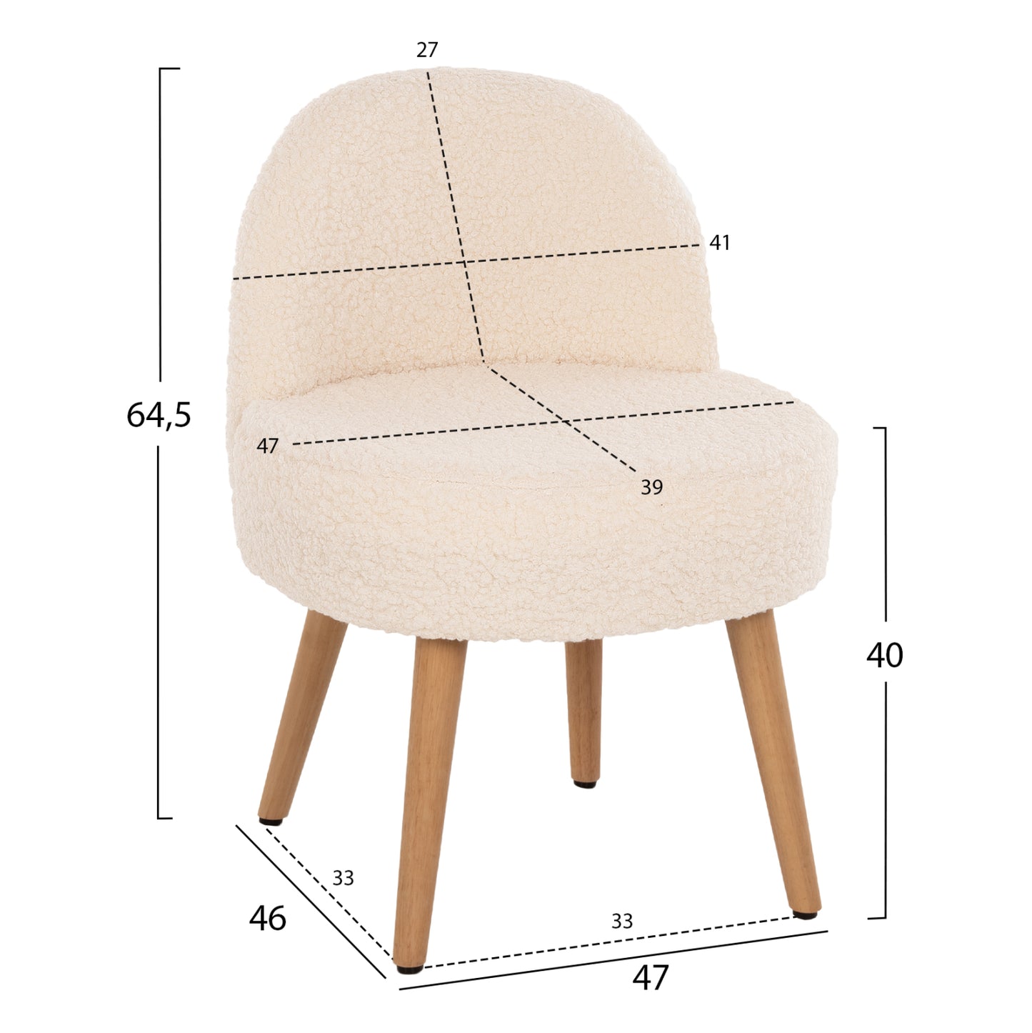Σκαμπό με πολύ χαμηλή πλάτη YASMINE με επένδυση από ζεστό μπουκλέ ύφασμα σε ΛΕΥΚΗ απόχρωση, με ξύλινα πόδια σε φυσική απόχρωση.